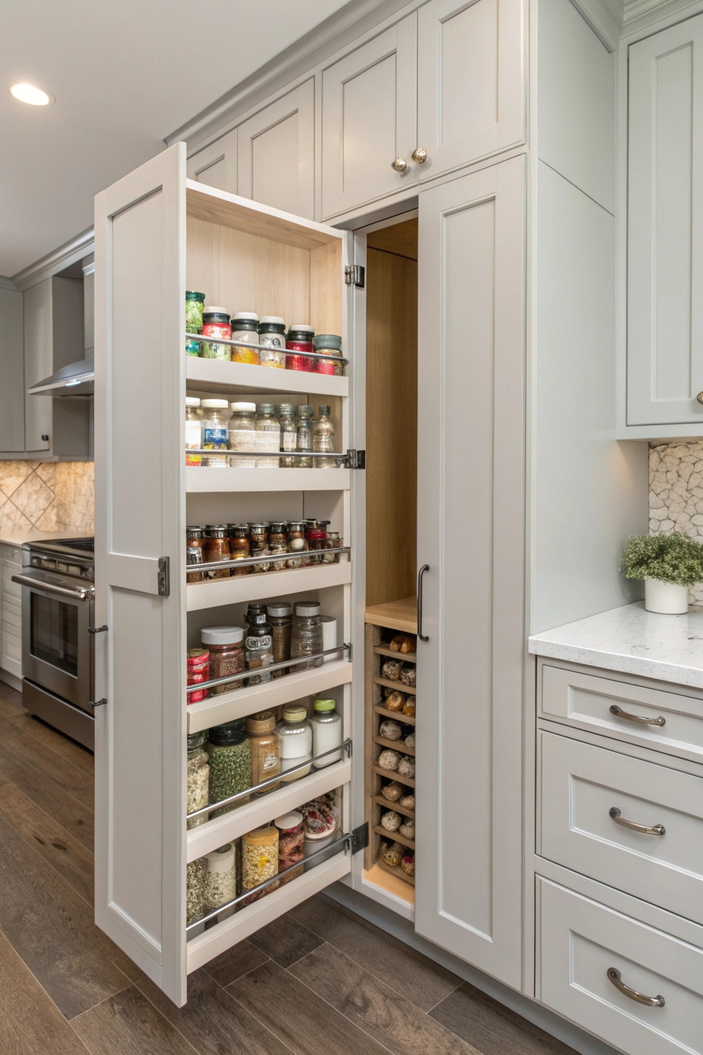 - Concealed racks inside cabinet doors for spices.