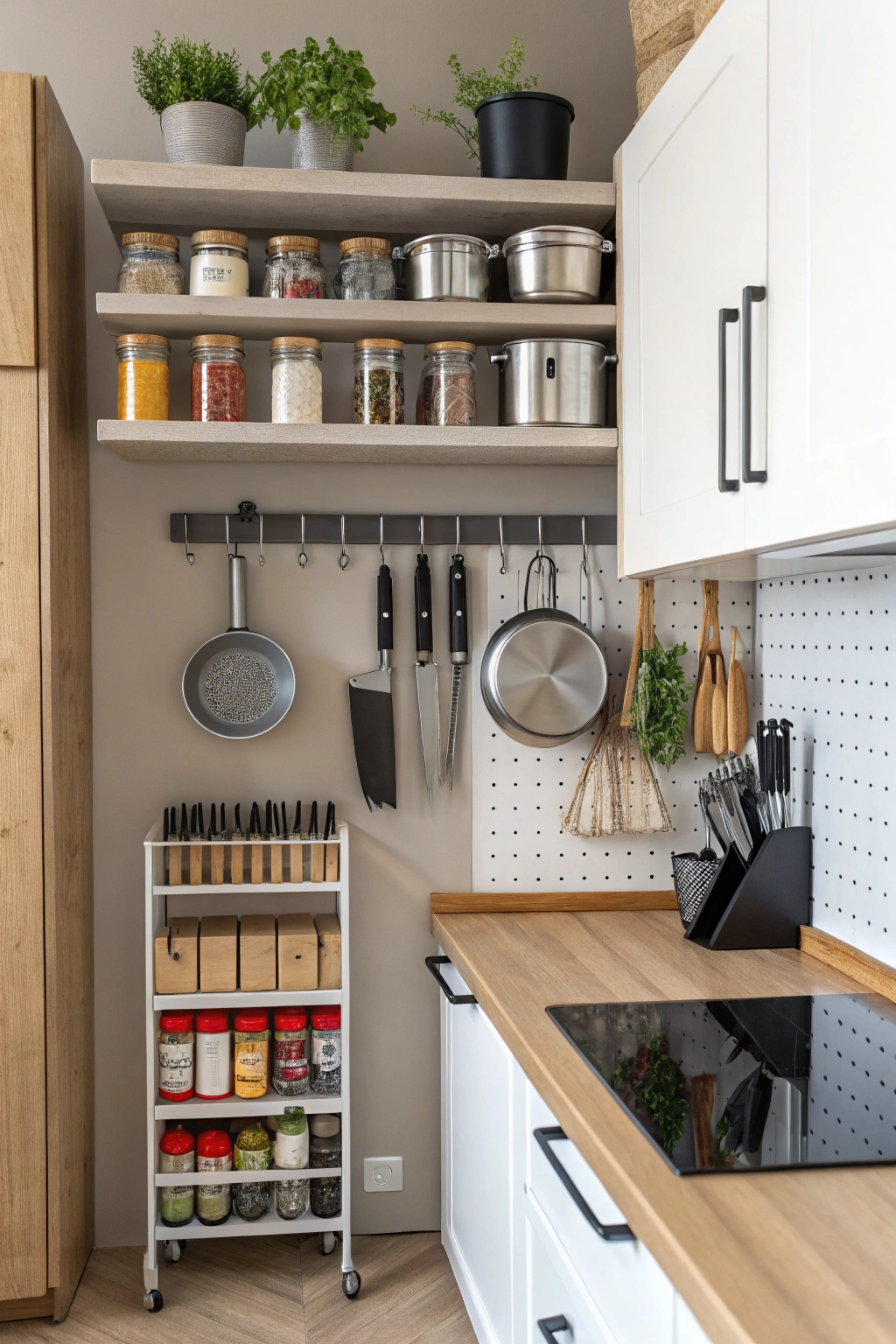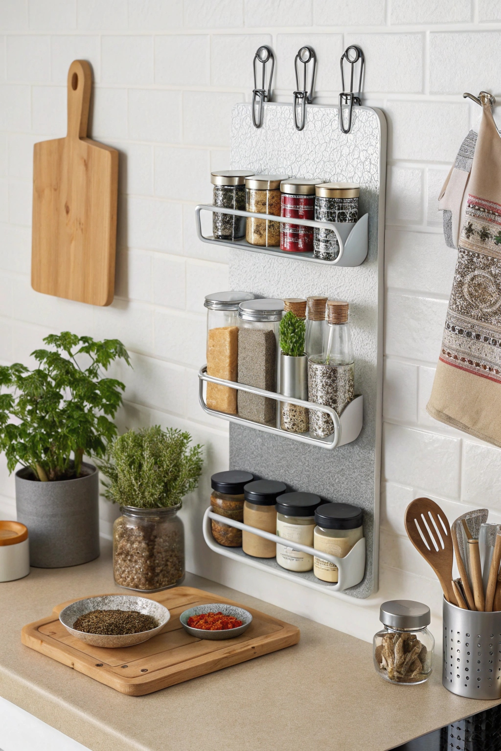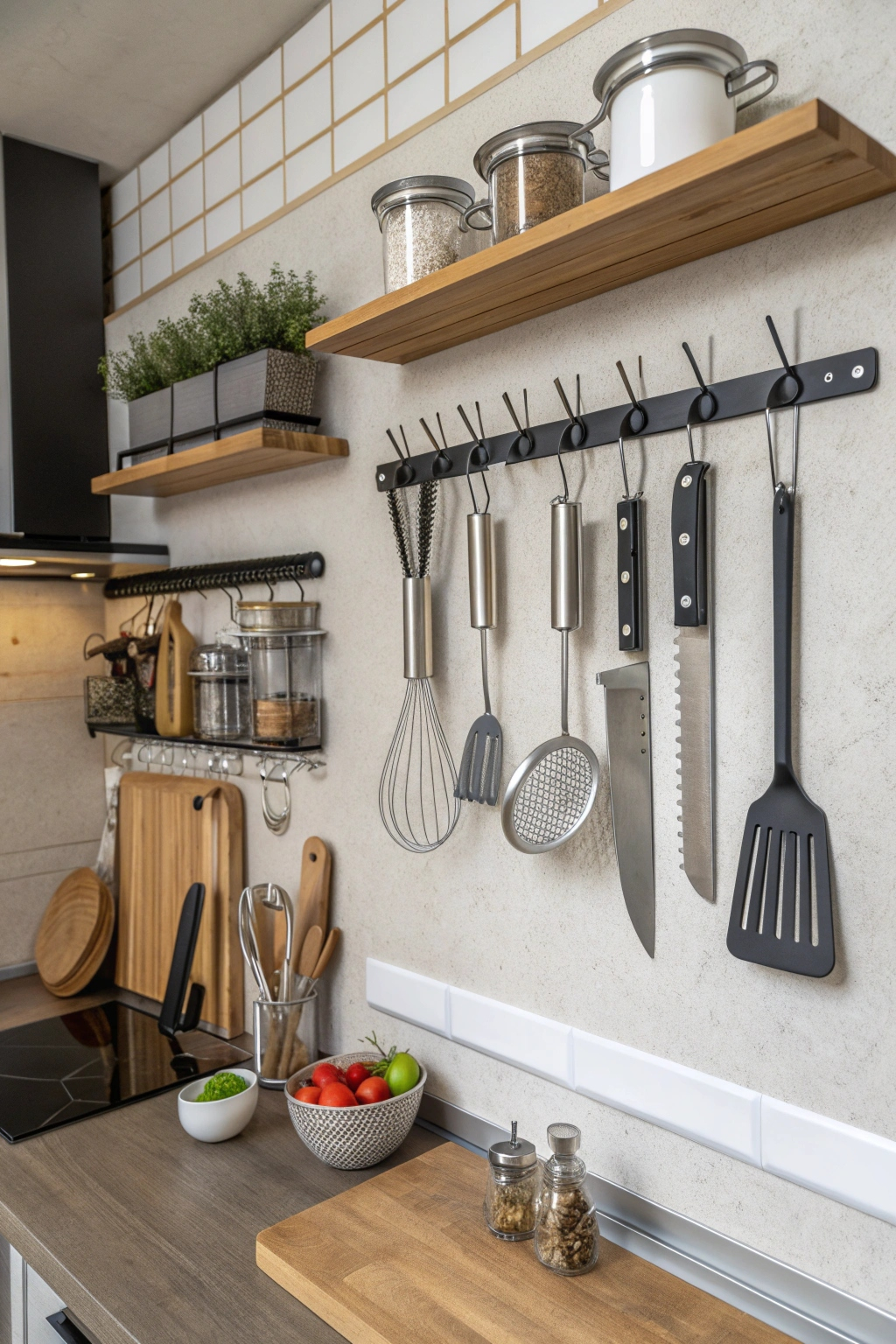 - Magnetic strips for holding metal utensils like knives.
