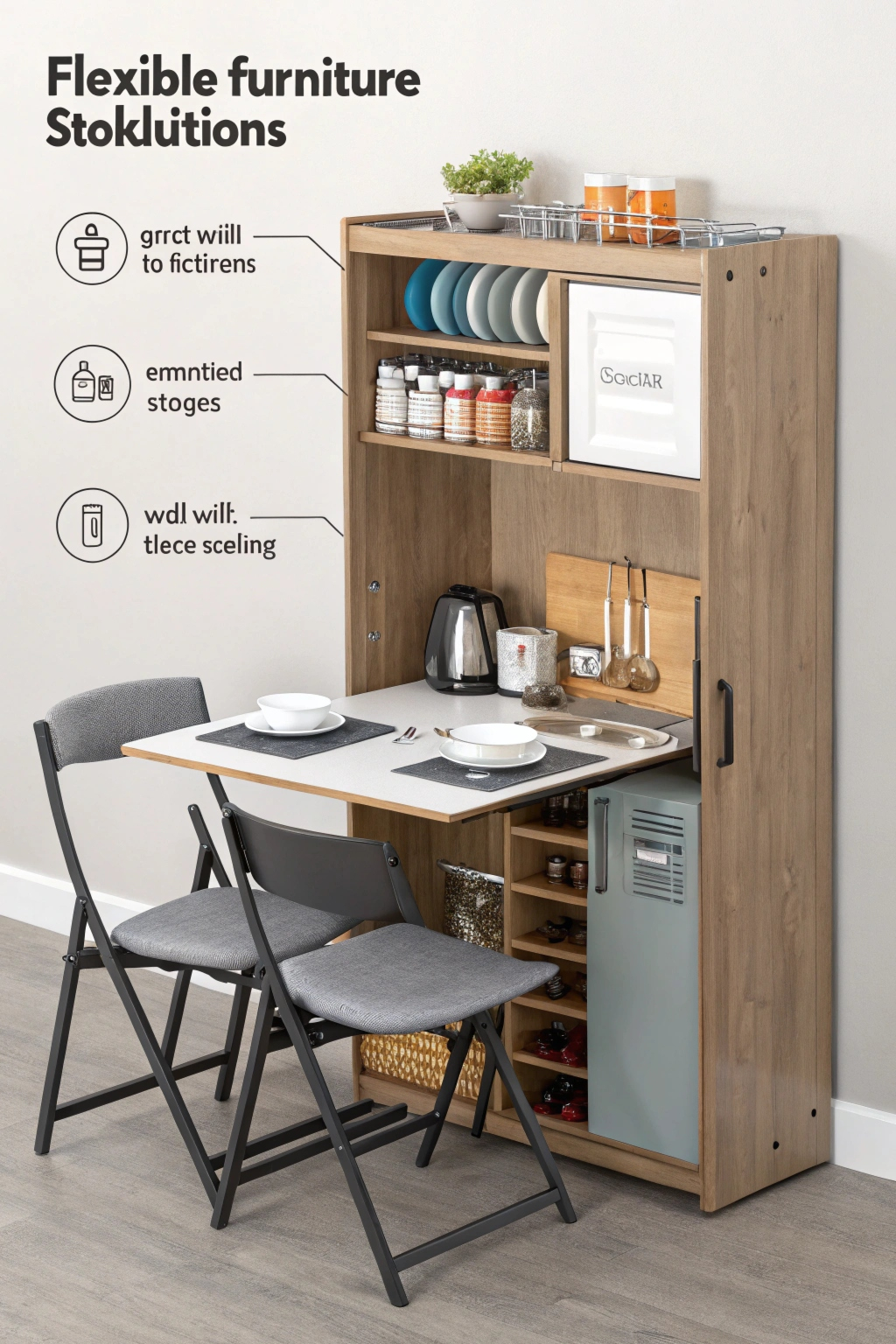 - Wall-mounted fold-down tables for cooking prep.