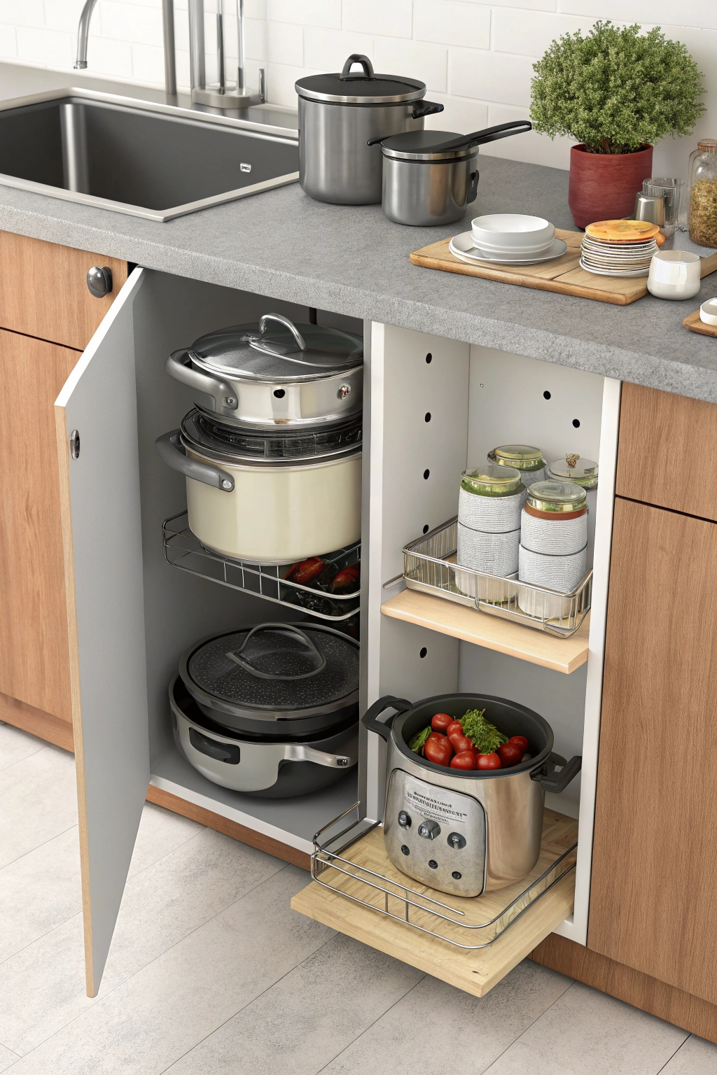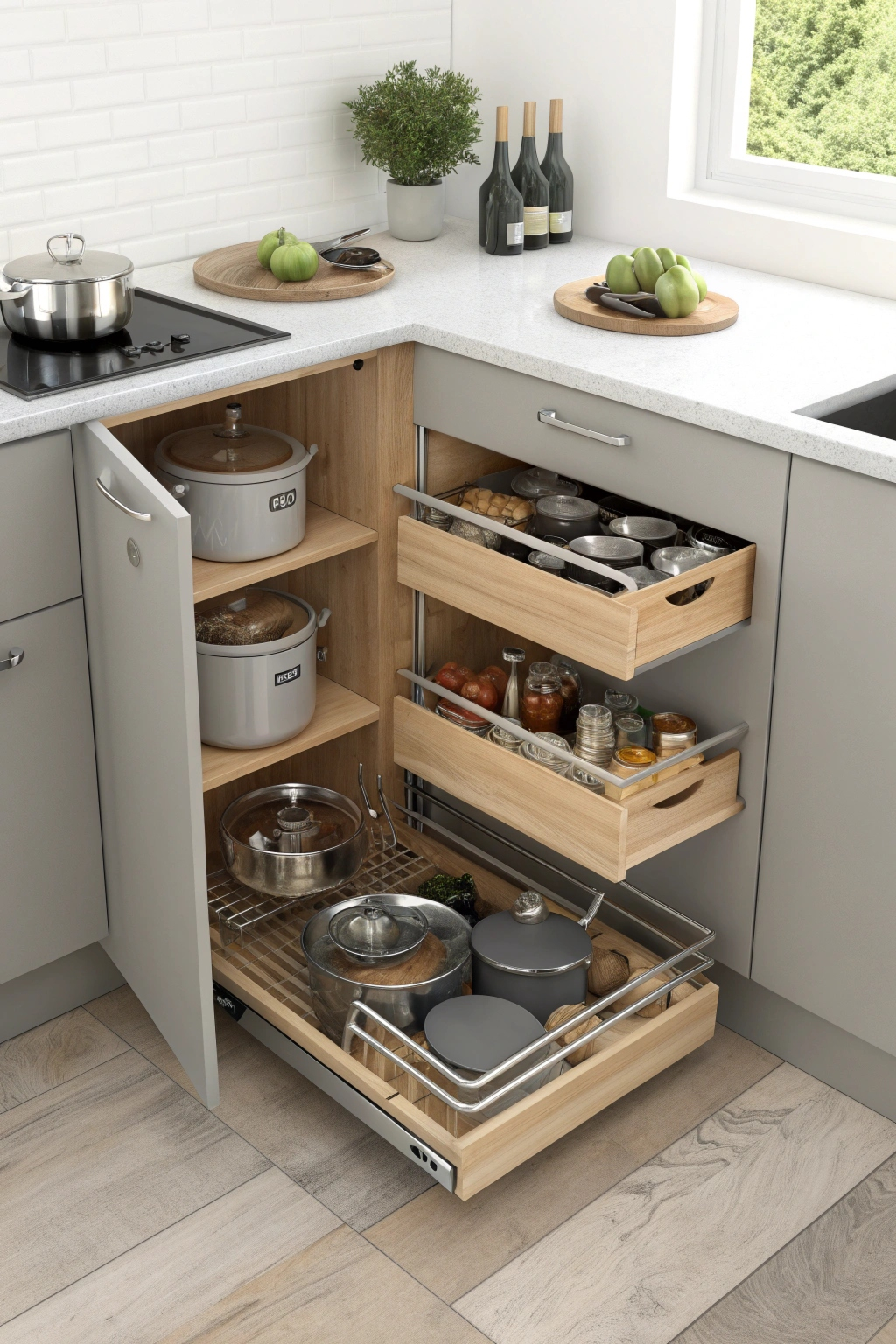- Pull-out shelves for easy access to pots and pans.