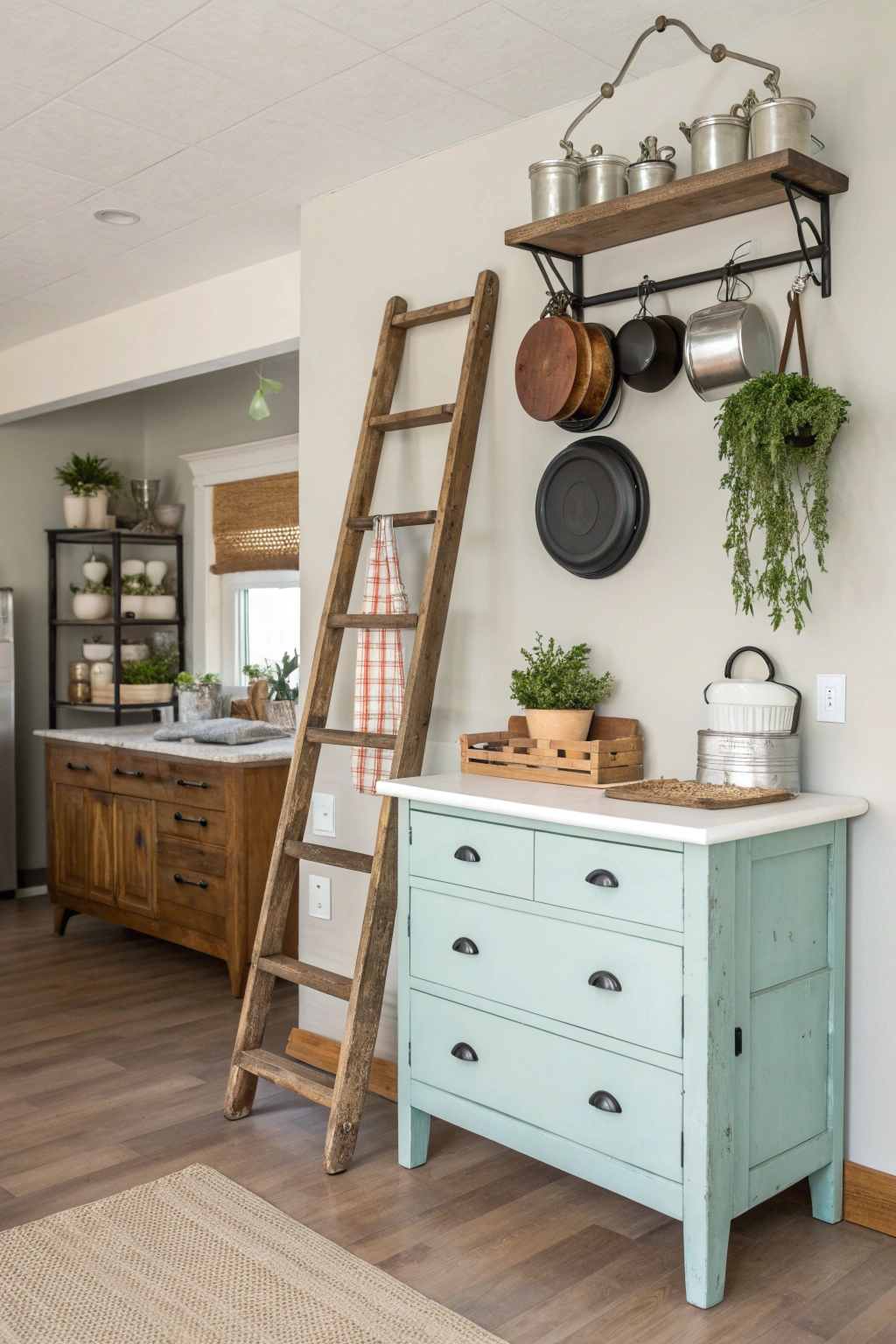 PinRepurposed furniture can transform your mini kitchen into a stylish and functional space without breaking the bank. Consider using an old wooden ladder as a unique shelving unit for your pots and pans. A vintage dresser can double as a kitchen island, providing extra storage and workspace. Don't forget to add a fresh coat of paint for a modern touch!