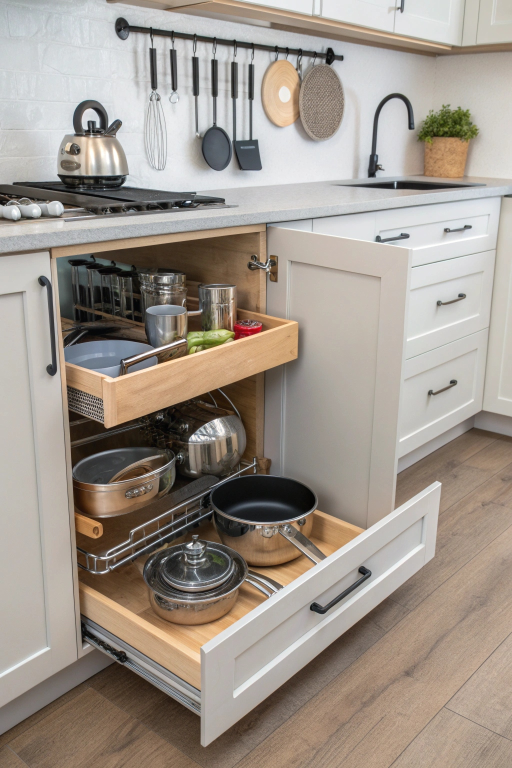 - Pull-out drawers for easy access to pots and pans.