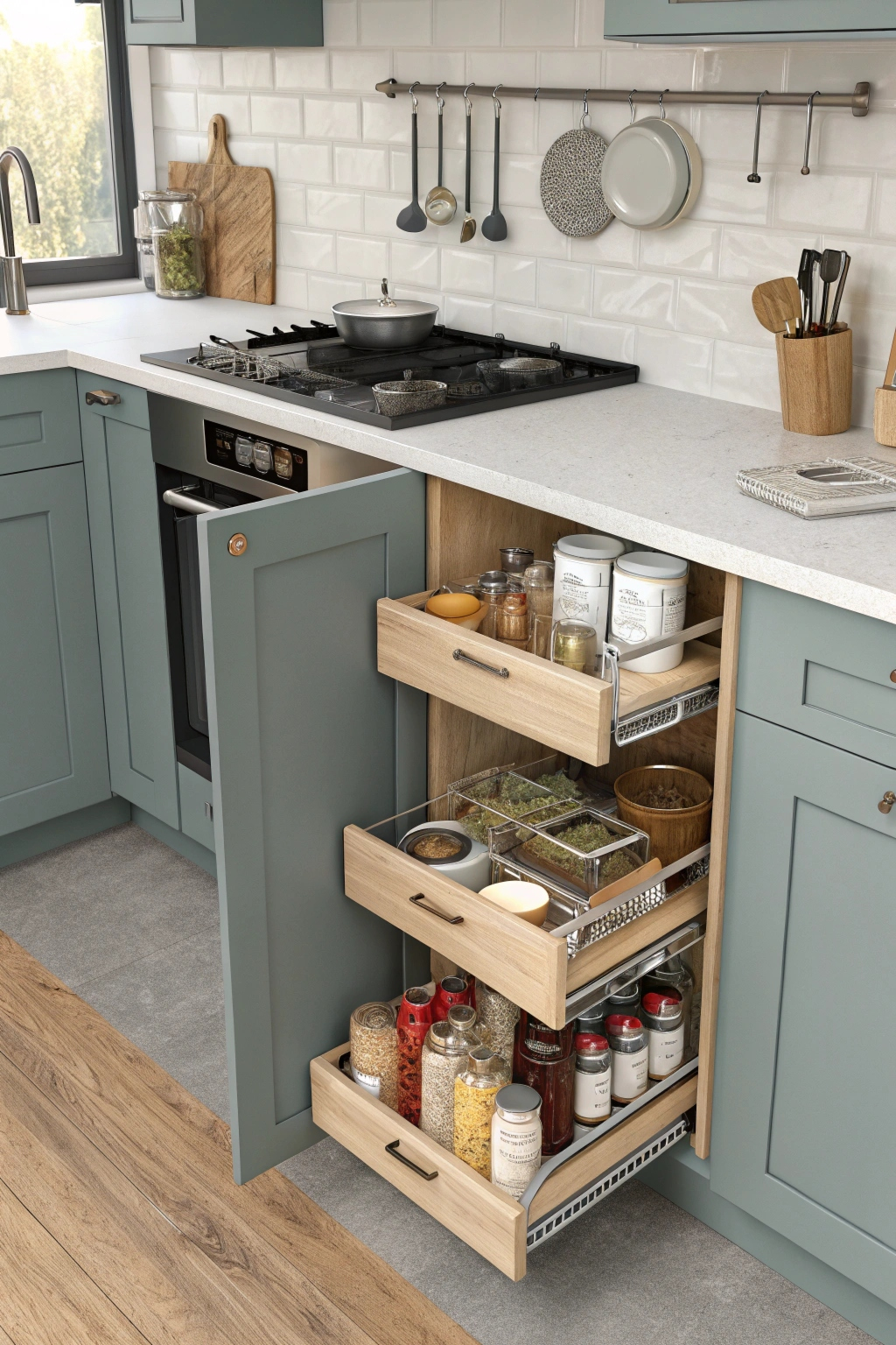 - Drawer-style pantry units for easy access to essentials.