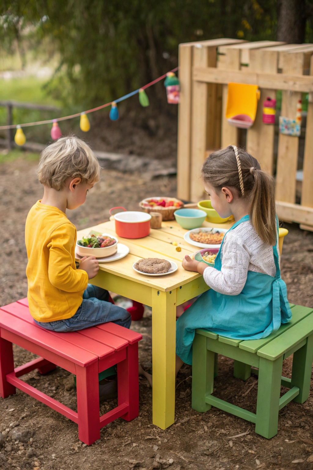 PinA tiny table and chairs set can transform your mud kitchen into an inviting spot for little chefs to gather and share their culinary creations. Choose weather-resistant materials for durability and vibrant colors to spark joy. Position the set near the kitchen to encourage teamwork and imagination, allowing kids to sit down after cooking to enjoy their mud pies and delicious discoveries together.