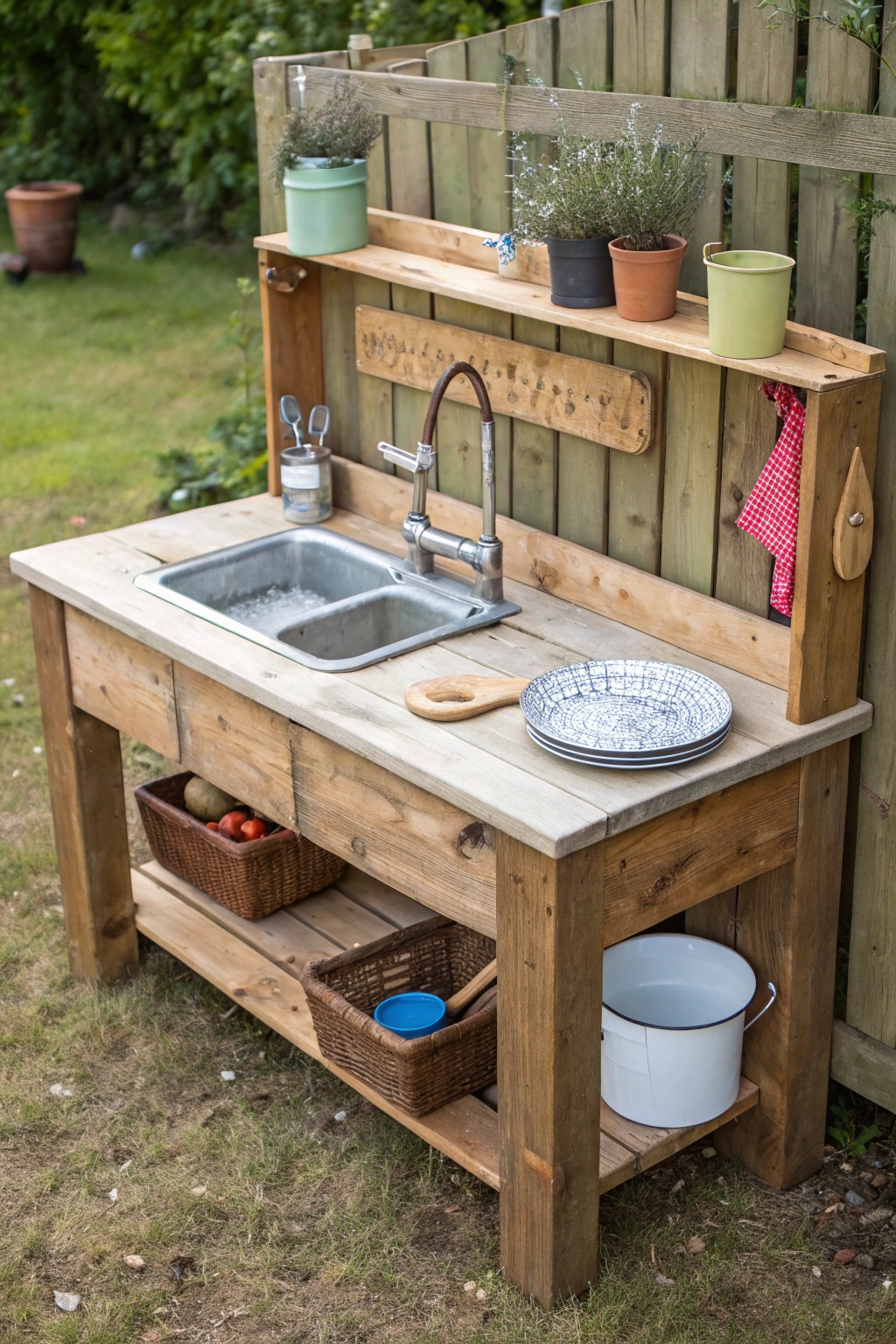 PinAdding a vintage sink to your mud kitchen not only brings character but also serves a practical purpose for messy play. You can fill it with water or mud, allowing your kids to mix and create freely. Plus, its unique design makes it a charming focal point. Encourage imaginative play while reusing a piece of history that adds flair to your outdoor space.