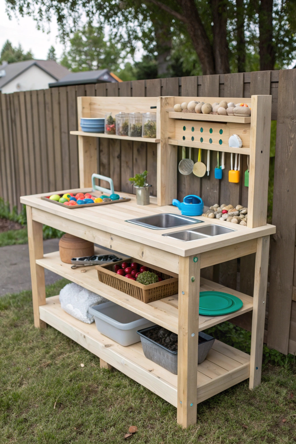 PinAn outdoor table with shelves is a fantastic addition to your mud kitchen, providing both functionality and a designated space for creative play. You can store toys, tools, and ingredients within reach, keeping everything organized. The shelves allow easy access to items while encouraging your kids to experiment. With a sturdy design, this table enhances outdoor exploration, making messy play even more enjoyable.