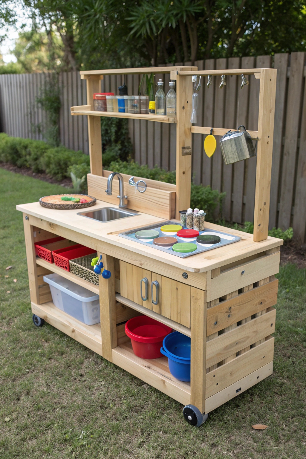 PinCreating a mud kitchen on wheels can add a whole new level of fun and versatility to your outdoor play area. You can easily move it to different spots in your yard, adapting to sunlight or shade as needed. Use wood or sturdy plastic for durability, and include various containers for mixing and serving. This setup encourages creativity, movement, and outdoor exploration for your kids.
