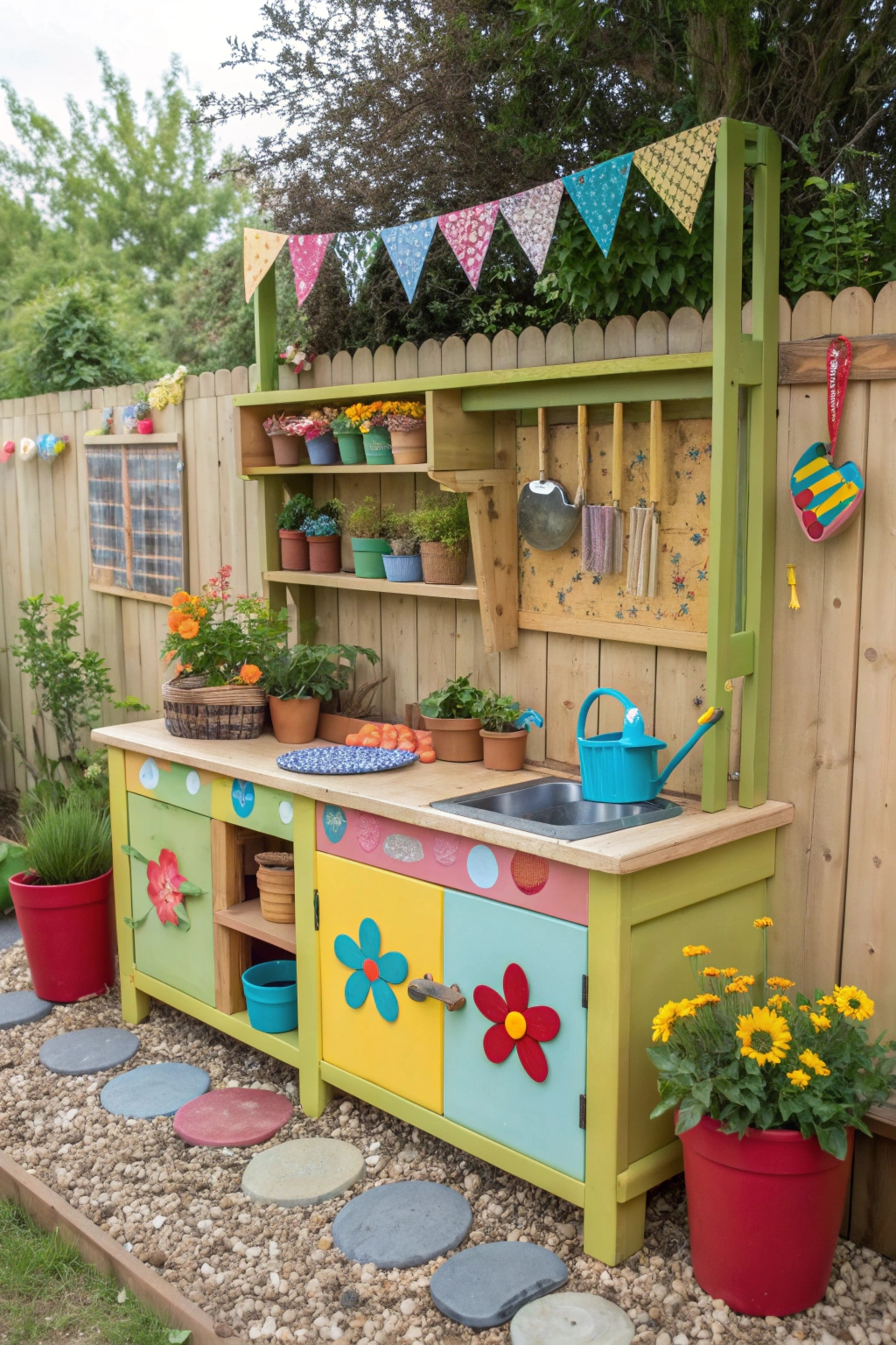 PinEnhancing your mud kitchen with garden-themed decor touches can create an inviting and imaginative atmosphere for kids. Consider adding colorful flower pots, whimsical garden signs, or even small trellises. Incorporating natural elements like pebbles or twigs can inspire creativity. Encourage kids to use themed utensils, like small watering cans or mini rakes, to enhance their play experience while connecting them to nature.