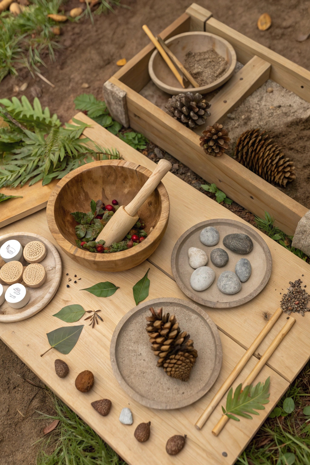 PinNature-inspired cooking tools bring a touch of the outdoors into your mud kitchen, making the cooking experience even more engaging for kids. Use items like sticks for stirring, leaves as plates, and rocks for weights. You can also gather pinecones or acorns for unique ingredients. These natural materials not only spark creativity but also encourage children to explore and connect with nature while playing.