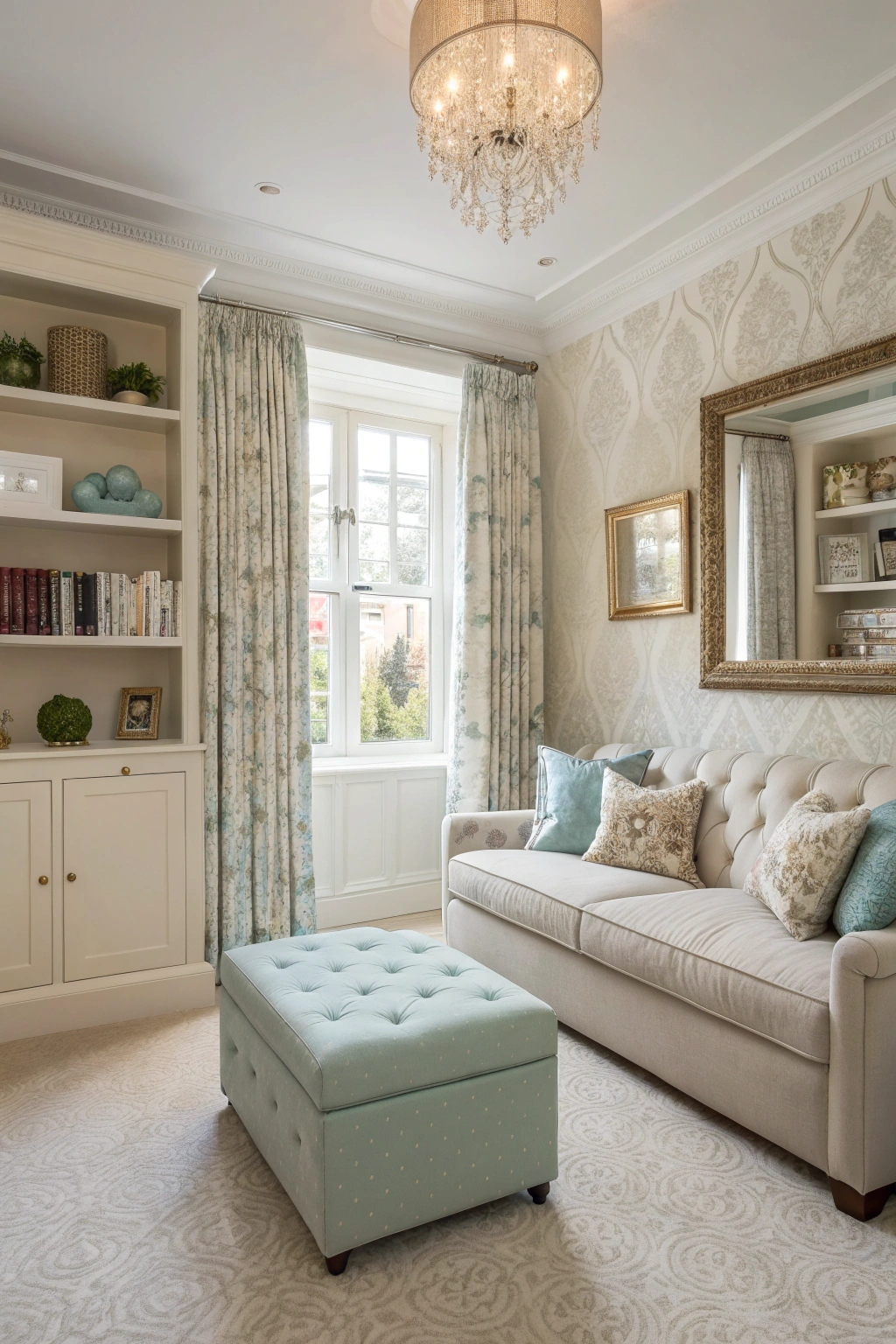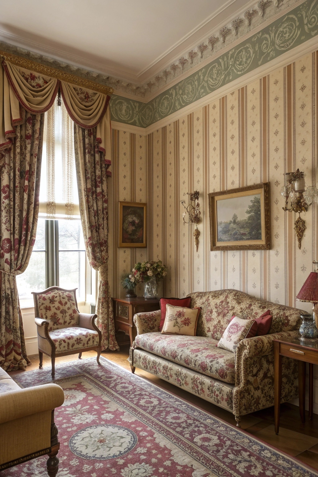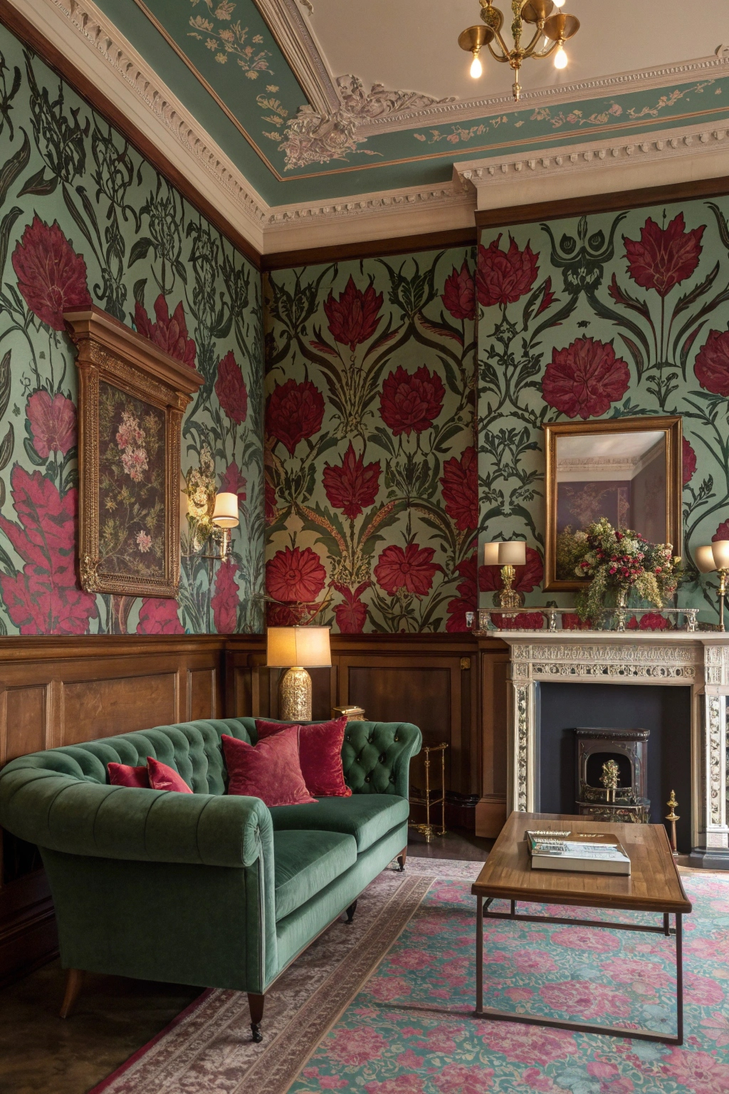 PinVictorian living rooms often feature intricate wallpaper designs that transform walls into stunning focal points. You can choose from bold florals, damask patterns, or geometric motifs to create an enchanting atmosphere. Opt for rich colors and luxurious textures to enhance the elegance of your space. Carefully select a design that complements your furnishings, making your living room both inviting and visually striking.