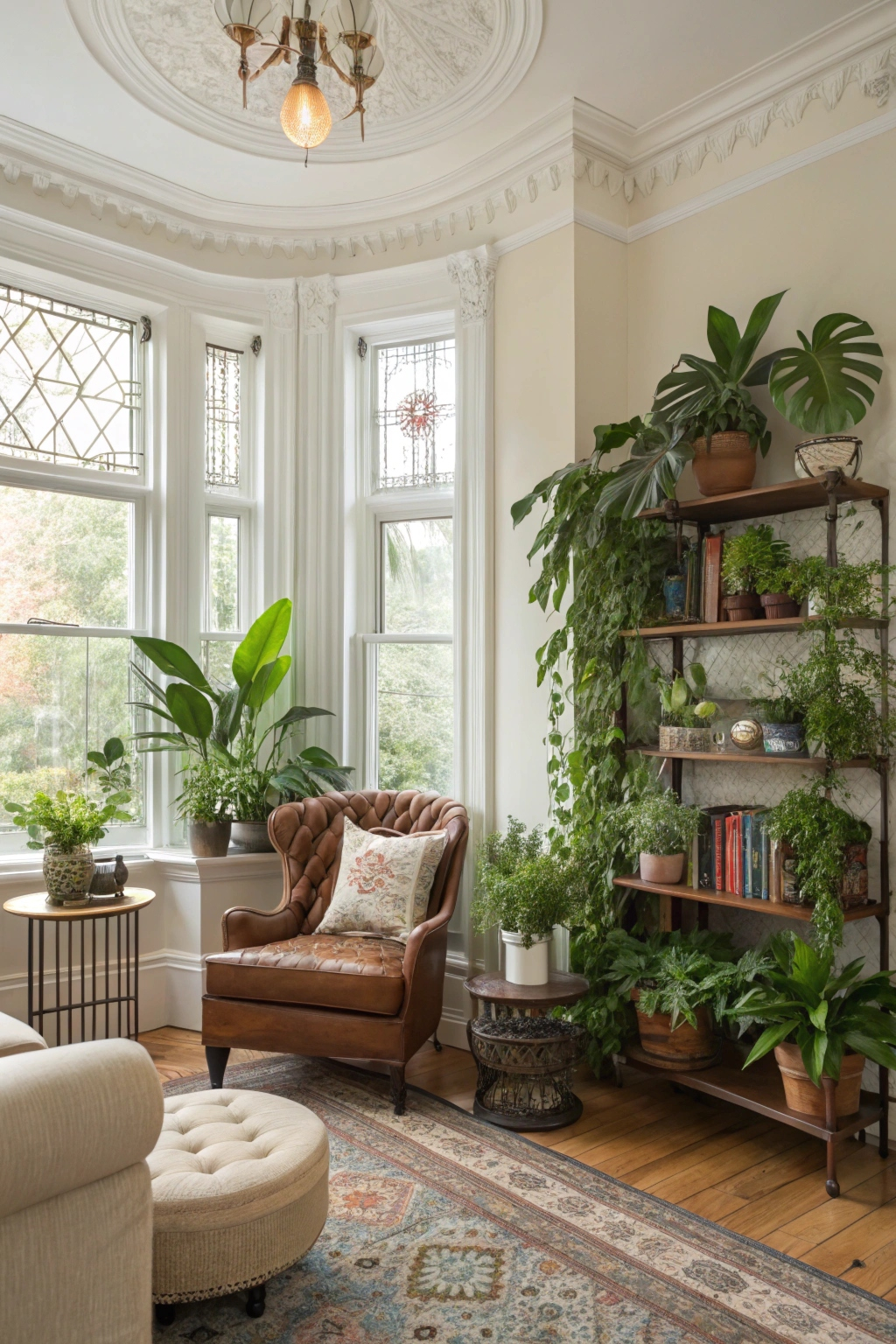 PinTransforming your Victorian living room with indoor plants can elevate its charm and provide a touch of nature. Arrange tall plants in corners to create height, and use smaller varieties on shelves or tables for balance. Group plants with varying leaf shapes and colors to add visual interest. Don't forget to take into account light conditions to guarantee they thrive in your beautifully styled space.