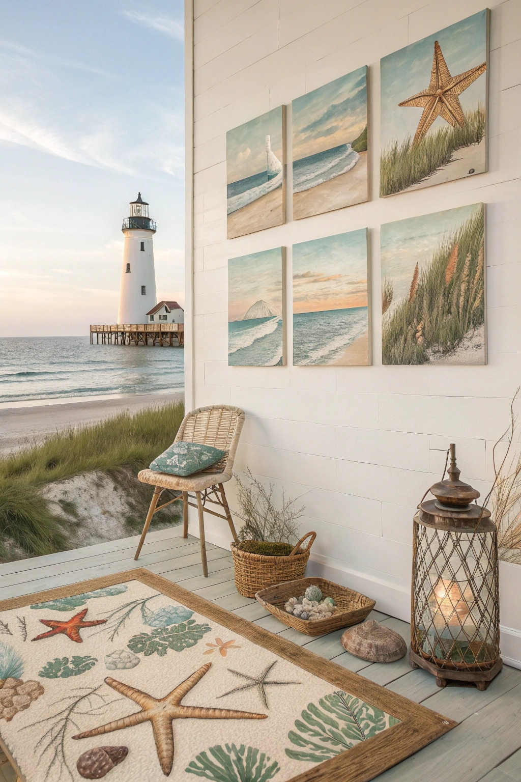 Choose rugs with nautical patterns or in solid coastal colors. Stripes, anchors, and seashells are all great options. A well-chosen rug can be a focal point and tie the room's decor together.