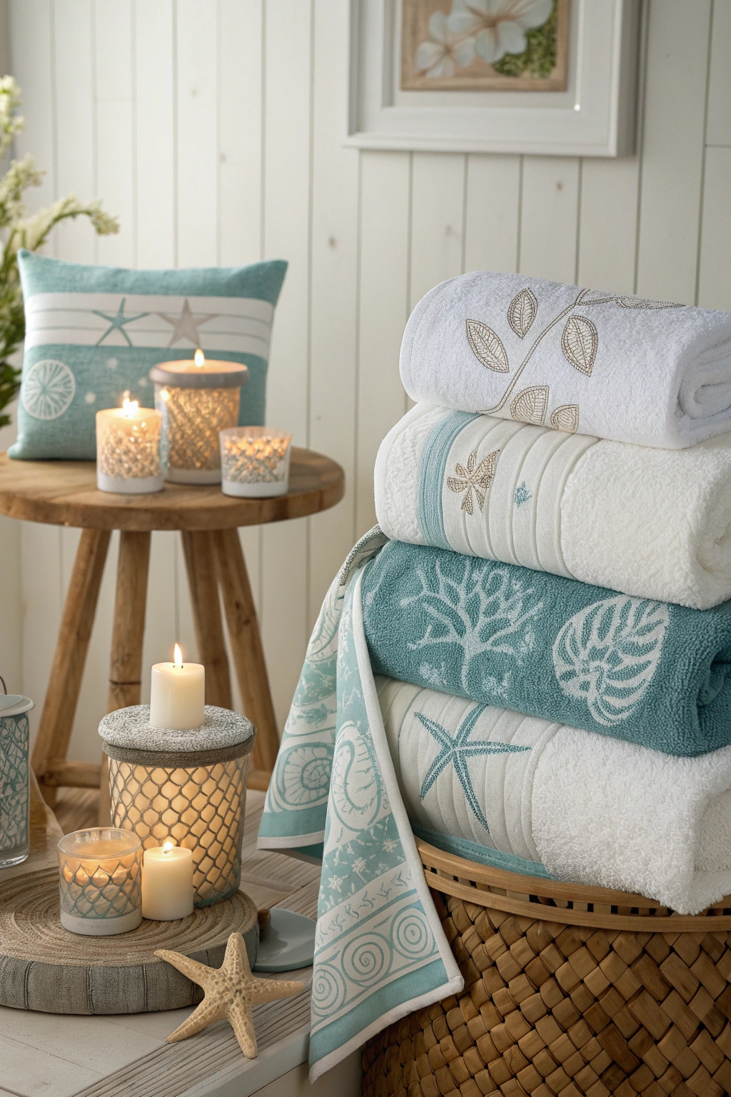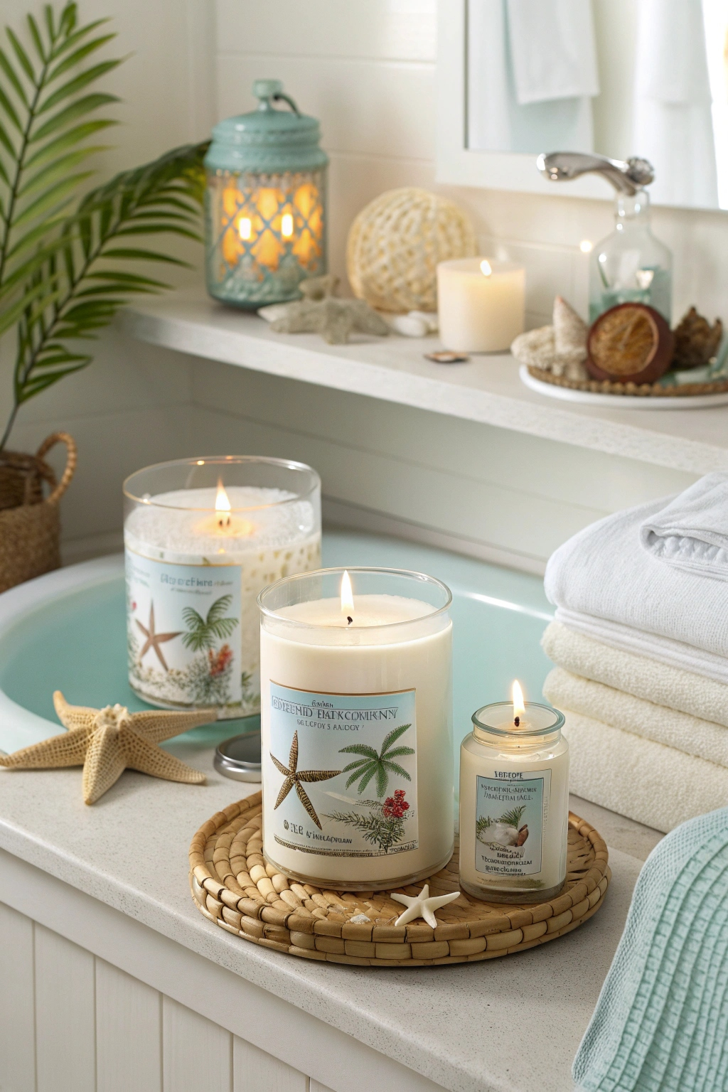 Choose scents that remind you of the beach, like sea breeze, coconut, or fresh linen. These will enhance the coastal atmosphere. Scented candles can make your bathroom feel like a serene retreat.