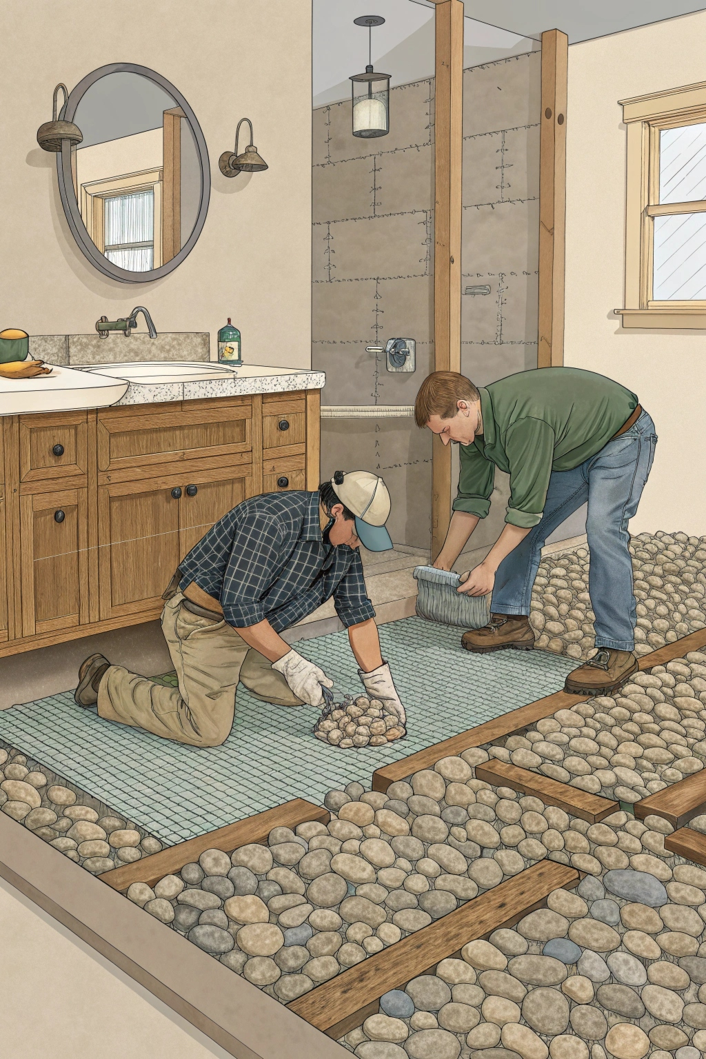 Stone and pebble floors mimic the natural look of a beach. They provide a unique, tactile experience that can make your bathroom feel like an outdoor oasis.