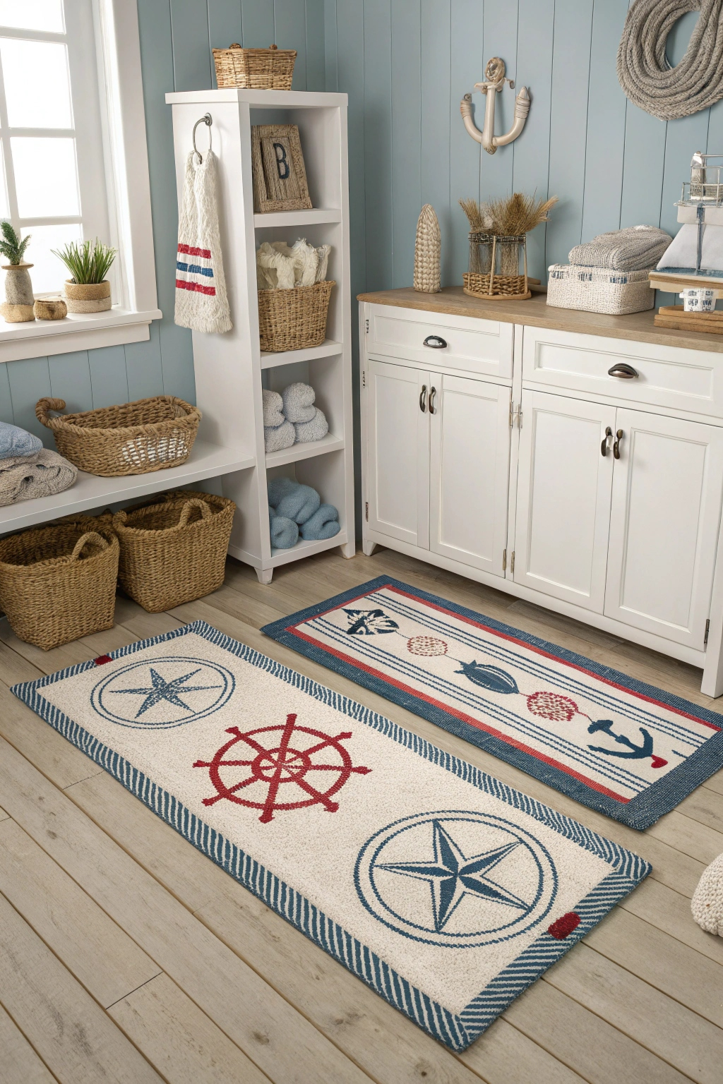 Effective storage solutions are essential for keeping your bathroom organized. Nautical-themed cabinets and shelves can add to the decor while providing practical storage.