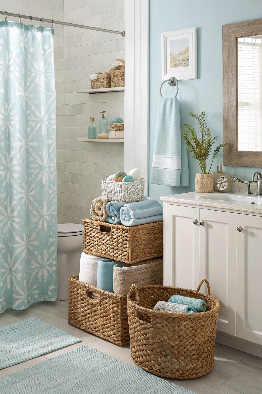 Wicker baskets and canvas bins work well in a coastal bathroom. Use them to store extra towels, toiletries, and other essentials. They add a natural and textured element to your decor.