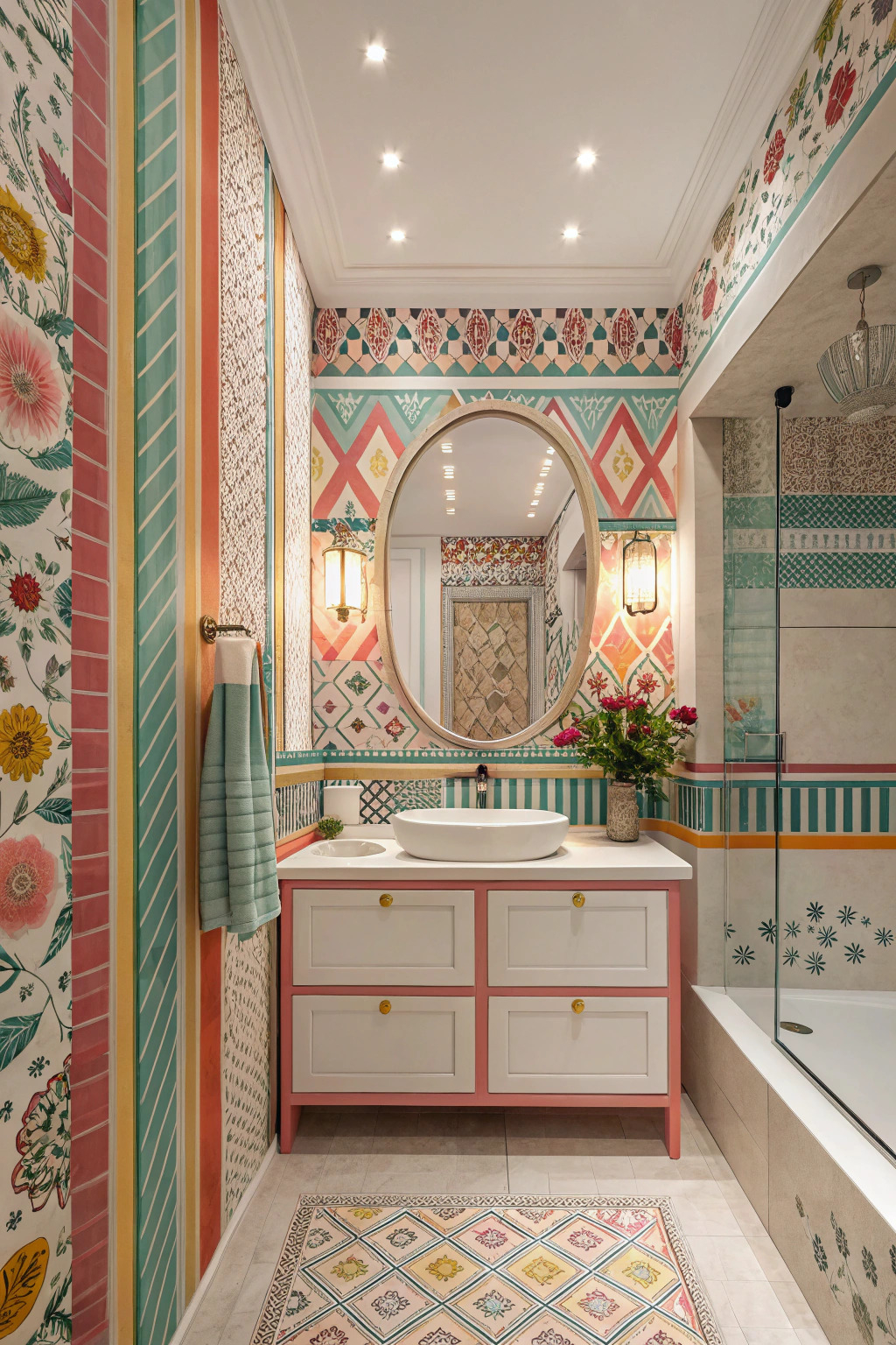 PinDon’t be afraid to combine patterns. Stripes, florals, and geometrics can work well together if they share a common color palette. This can make your bathroom décor more dynamic and fun.