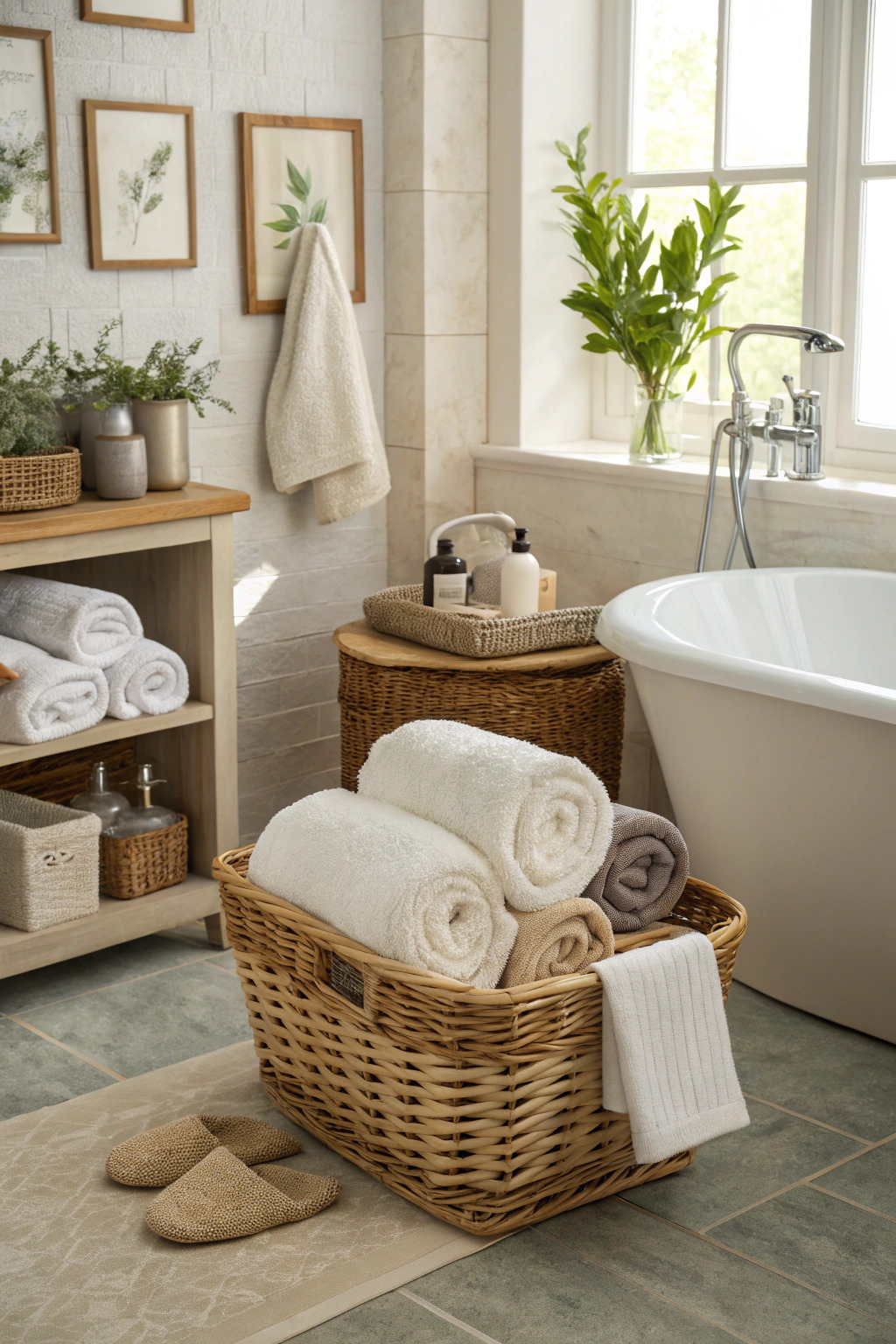 PinWicker baskets or fabric bins can store rolled towels attractively. Place them under the sink, next to the bathtub, or on shelves for easy access and a cozy look.