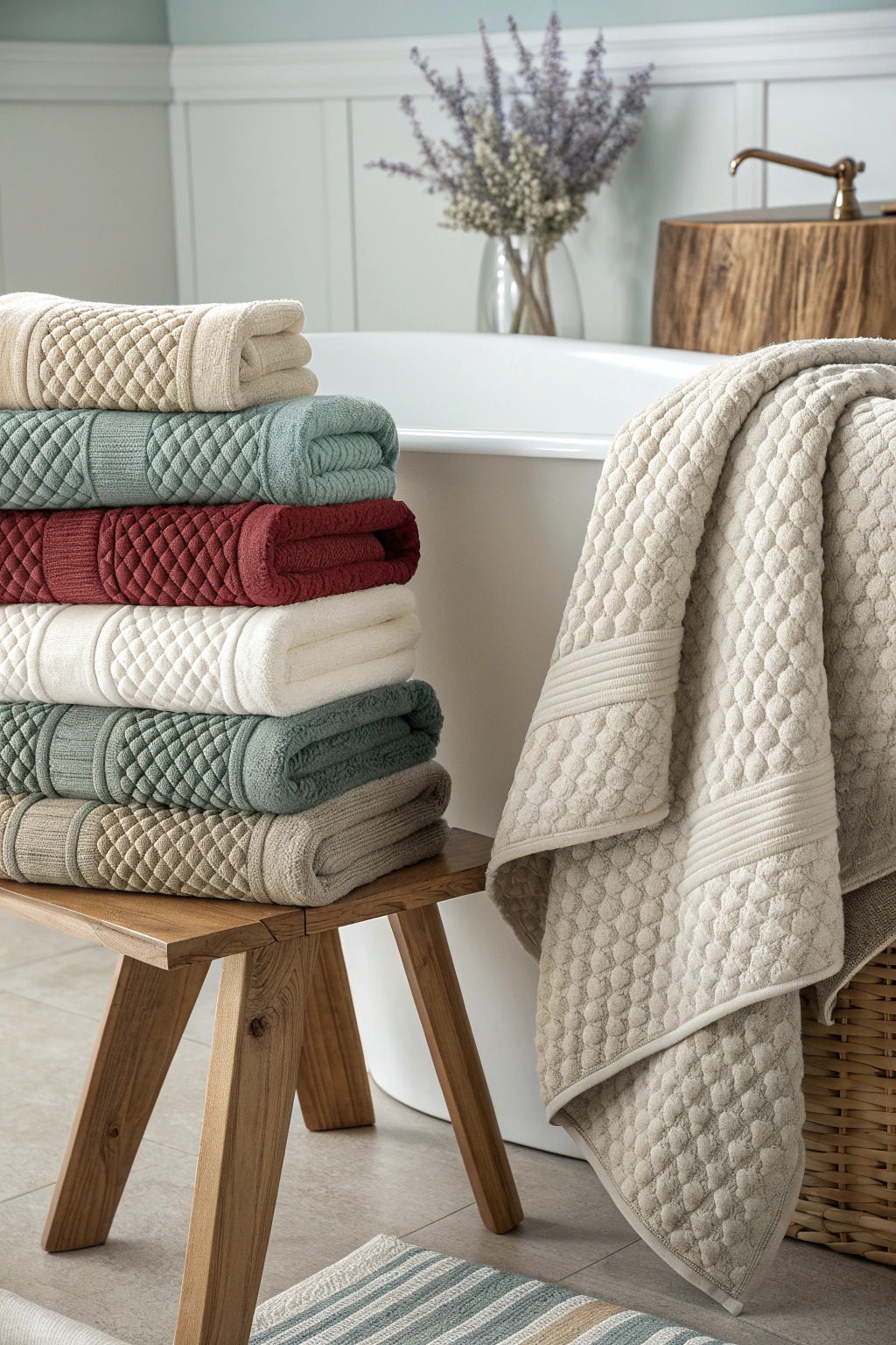 PinMix different textures for a rich, layered look. Combine smooth cotton towels with ribbed or waffle-knit towels. This adds visual interest and a tactile element to your bathroom.