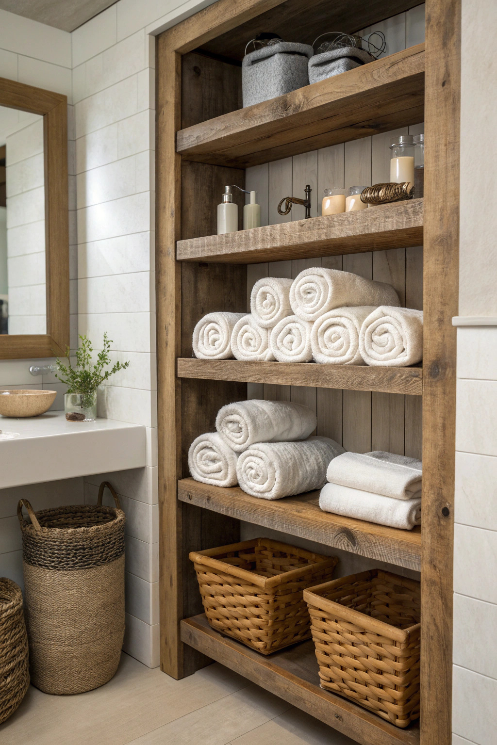 PinRustic charm can be achieved with earth-toned towels, wooden accents, and vintage décor. Rolled towels in a wire basket or on wooden shelves add to the rustic aesthetic.