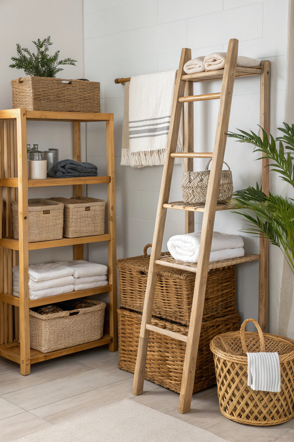 PinUse sustainable materials for your storage solutions. Bamboo shelves, wicker baskets, and reclaimed wood ladders are eco-friendly and stylish options for storing your towels.