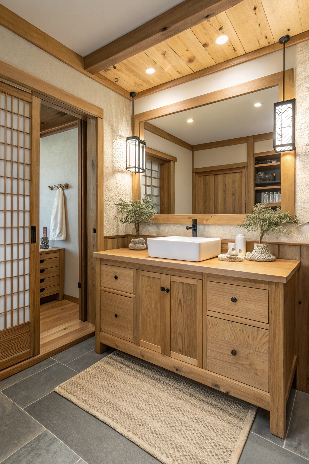 PinA custom wooden vanity can provide storage while maintaining the natural and minimalist aesthetic of a Japanese-inspired bathroom. The natural wood material adds warmth and texture, creating a harmonious and inviting environment. Customizing your vanity allows you to tailor it to your specific needs and preferences, ensuring a functional and aesthetically pleasing design. A well-designed wooden vanity can enhance the overall ambiance and functionality of your bathroom.