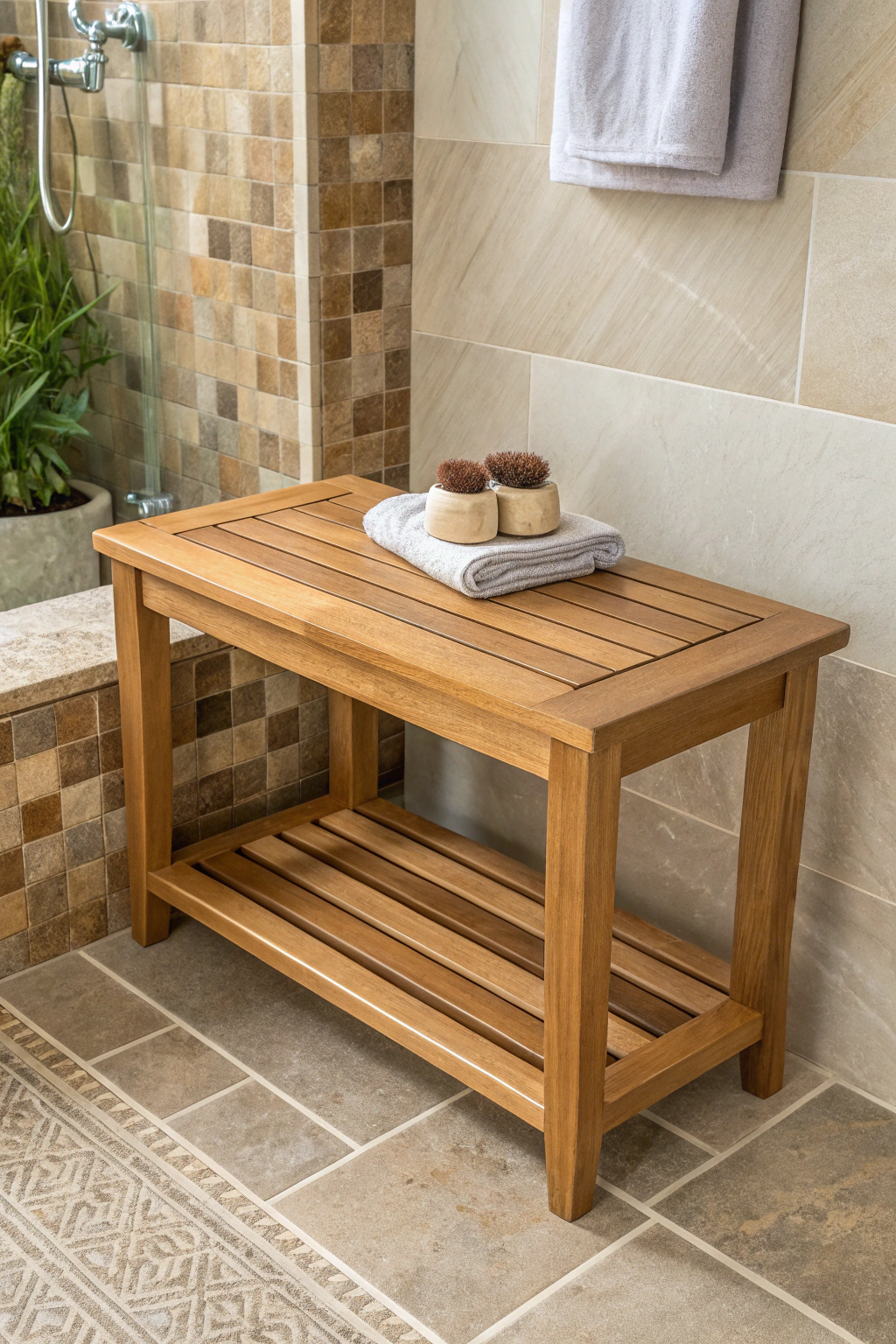 PinA teak shower bench adds warmth and functionality to your bathroom, providing a place to sit and relax. Teak wood is naturally resistant to moisture and decay, making it an ideal material for a shower bench. The rich, golden-brown color and smooth texture of teak create a luxurious and inviting atmosphere. A well-placed teak bench can serve as a practical and decorative element, enhancing the overall aesthetic and comfort of your bathroom.