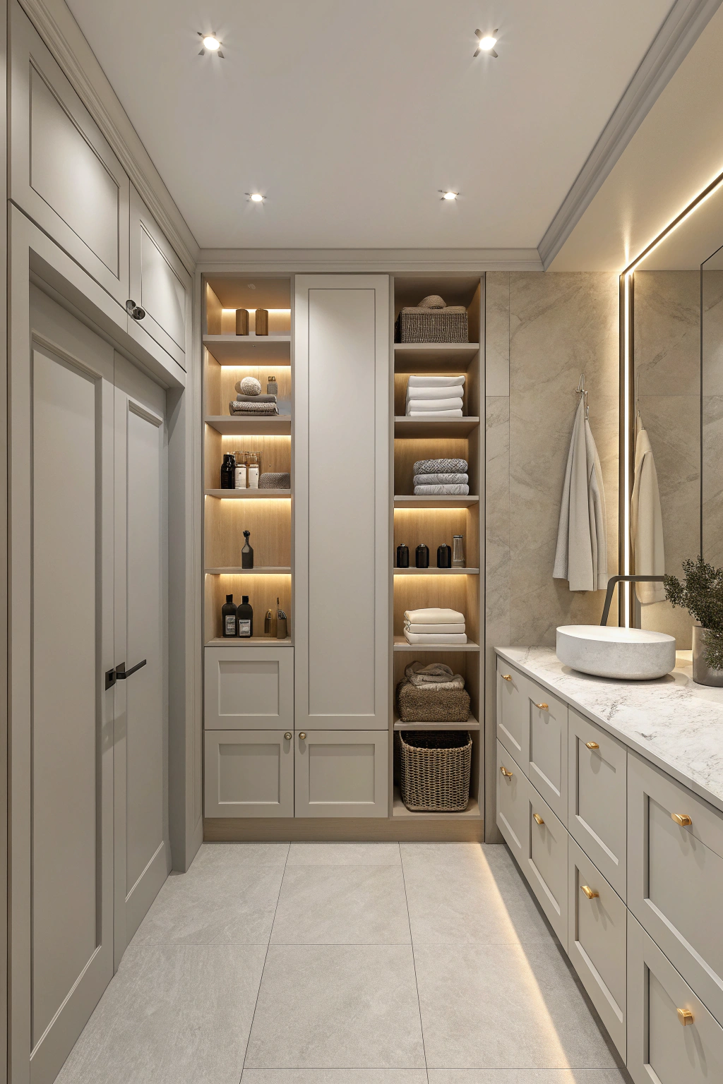 PinDesigning integrated storage solutions in your bathroom helps to keep the space clutter-free and maintain the minimalist aesthetic. Built-in cabinets, recessed shelves, and hidden compartments provide ample storage for essentials while keeping surfaces clean and organized. Integrated storage solutions can be customized to fit your needs and preferences, ensuring a functional and visually pleasing environment. The seamless integration of storage elements enhances the overall design and contributes to a sense of order and tranquility.