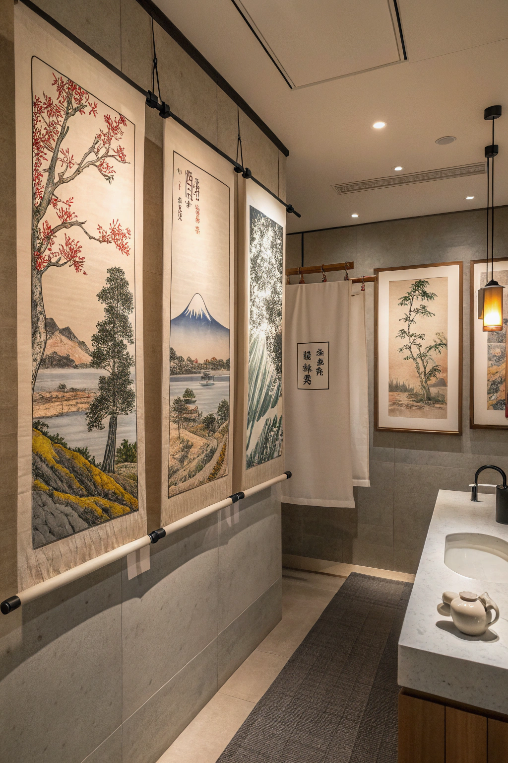 PinHanging Japanese art prints or calligraphy in your bathroom can add a cultural and artistic element. These prints often feature traditional themes such as nature, landscapes, or Zen-inspired motifs, enhancing the overall ambiance. The simplicity and elegance of Japanese art can create focal points and add visual interest to your space. Whether you choose woodblock prints, ink paintings, or calligraphic works, Japanese art can elevate the aesthetic and cultural significance of your bathroom.