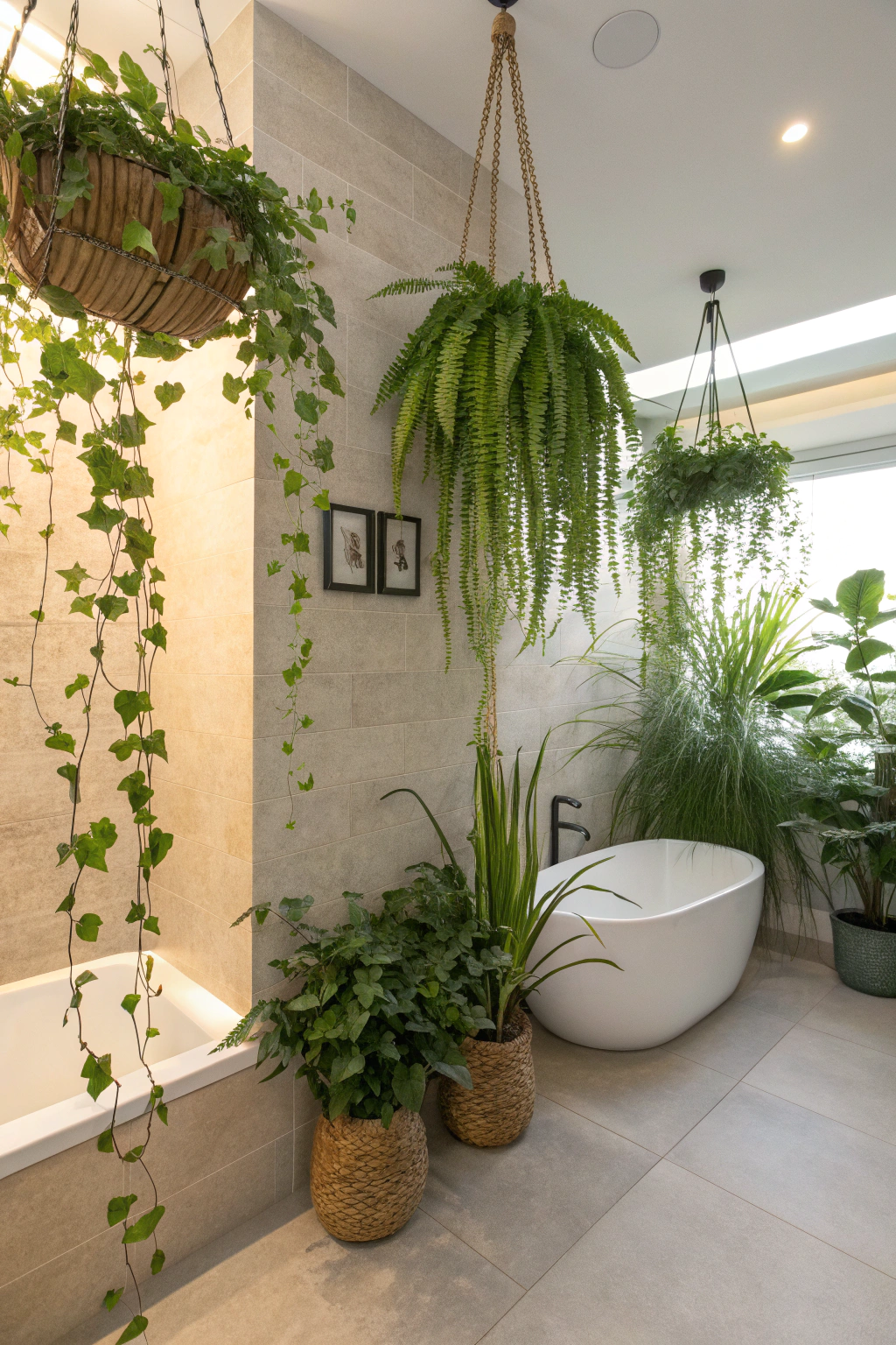 PinHanging plants are an excellent way to add greenery to your bathroom without taking up floor space. Plants such as ivy, ferns, or spider plants can be hung from the ceiling or mounted on walls, bringing a touch of nature indoors. The lush greenery not only enhances the aesthetic appeal but also improves air quality and creates a calming environment. Hanging plants can be arranged in various ways to complement the overall design and ambiance of your bathroom.
