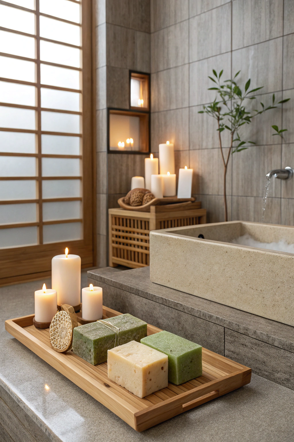 PinUsing natural soap and candles in your bathroom can add pleasant scents and enhance the overall spa-like experience. Natural soaps made from organic ingredients provide a gentle and luxurious cleansing experience, while scented candles create a calming and inviting atmosphere. The use of natural and eco-friendly products aligns with the principles of a Japanese-inspired bathroom, promoting a sense of well-being and relaxation.