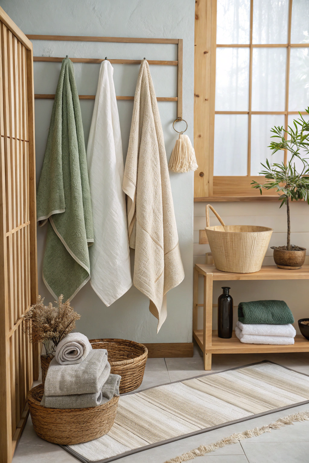 PinUsing towels made from natural fibers such as cotton or linen adds a soft and eco-friendly touch to your bathroom. These materials are highly absorbent, durable, and gentle on the skin, providing a luxurious and comfortable experience. Natural fiber towels come in various textures and colors, allowing you to choose options that complement your overall design. The use of natural fibers also aligns with the eco-friendly and sustainable principles of a Japanese-inspired bathroom.