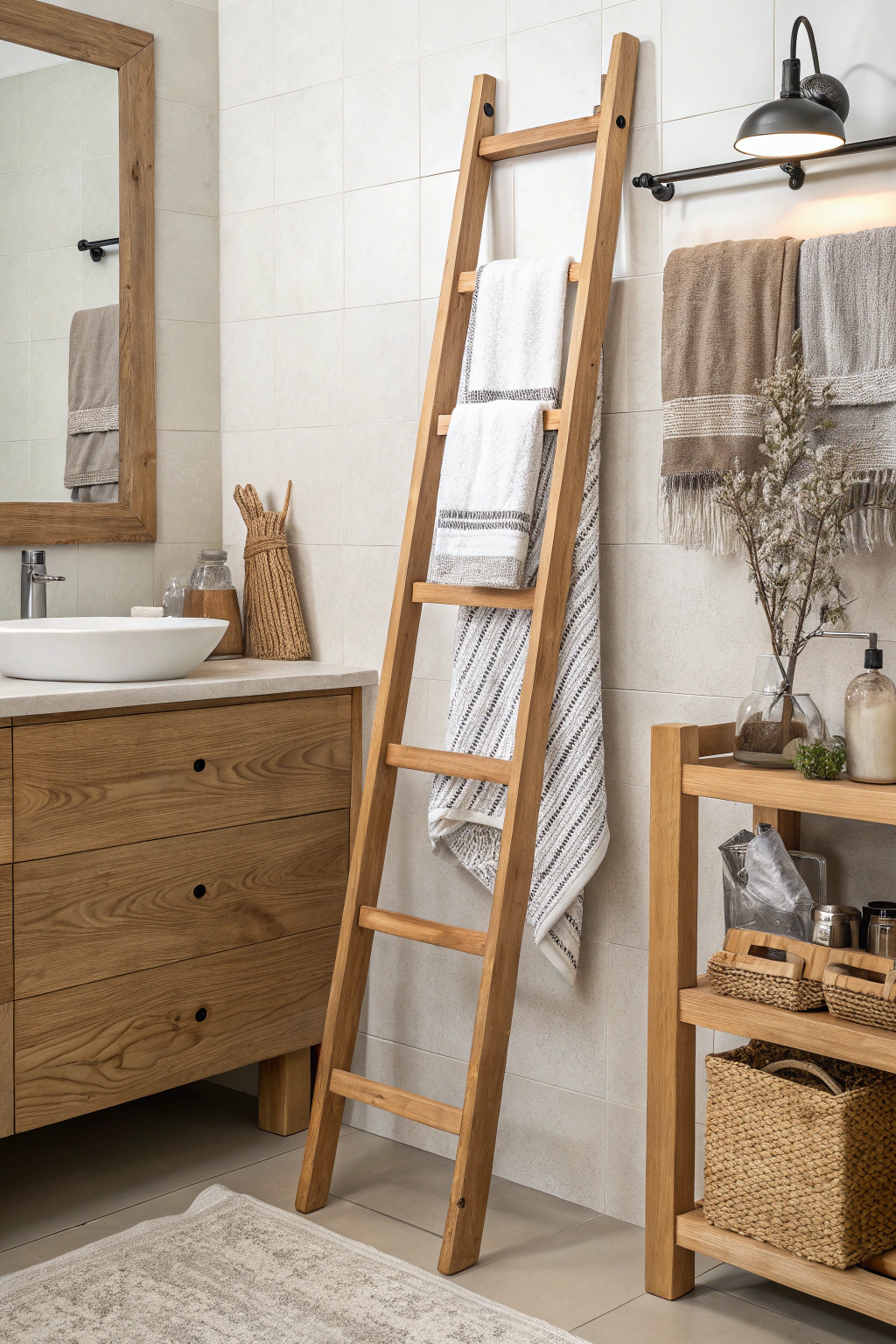 PinWooden ladders can be used as towel racks in your bathroom, adding a rustic and functional element. These ladders provide a unique and stylish way to hang towels and other accessories, creating a visually appealing and organized space. The natural wood material adds warmth and texture, complementing the overall design. Wooden ladders can also be used as decorative elements, enhancing the aesthetic and functional appeal of your bathroom.