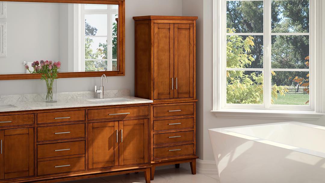 The cabinet's rich brown color contrasts beautifully with the bathroom's white theme, adding a touch of warmth to the overall decor.