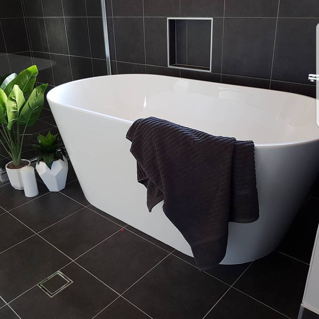 The focal point is a stylish bathtub, pristine and inviting, with a black towel casually draped over its edge, adding a touch of contrast and texture.