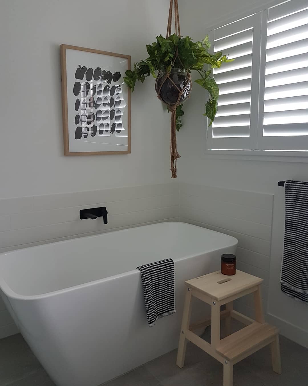 Adjacent to the bathtub, a well-cared-for houseplant thrives in a white flowerpot, its lush green leaves breathing life into the monochromatic palette of the room.