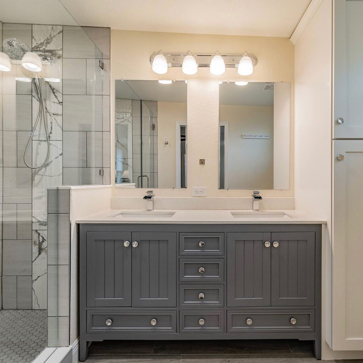 A white bathroom cabinet sits under the sink, providing ample storage space.