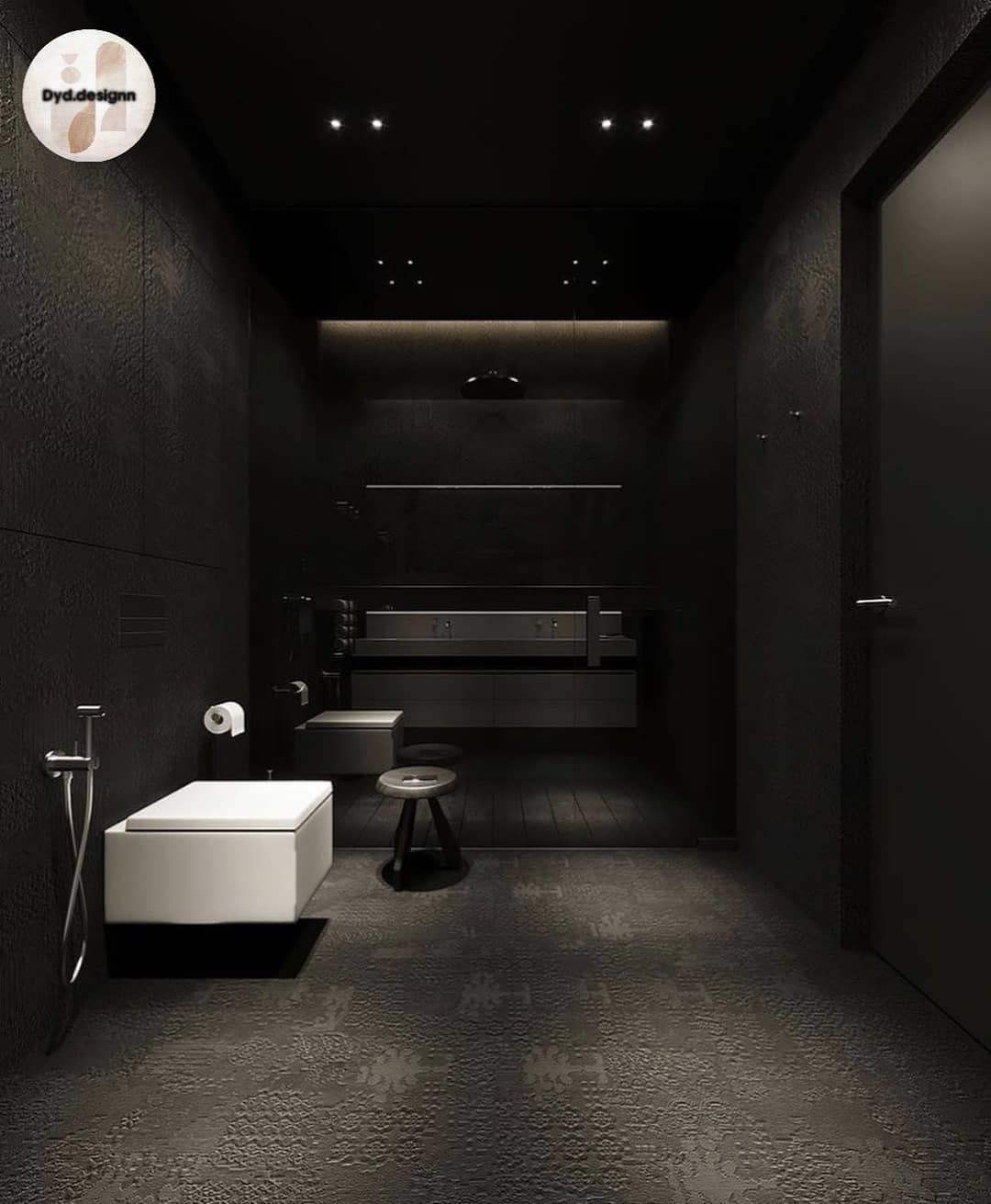 The room is indoors, with a dominant color scheme of black, which lends a sophisticated touch to the interior design.