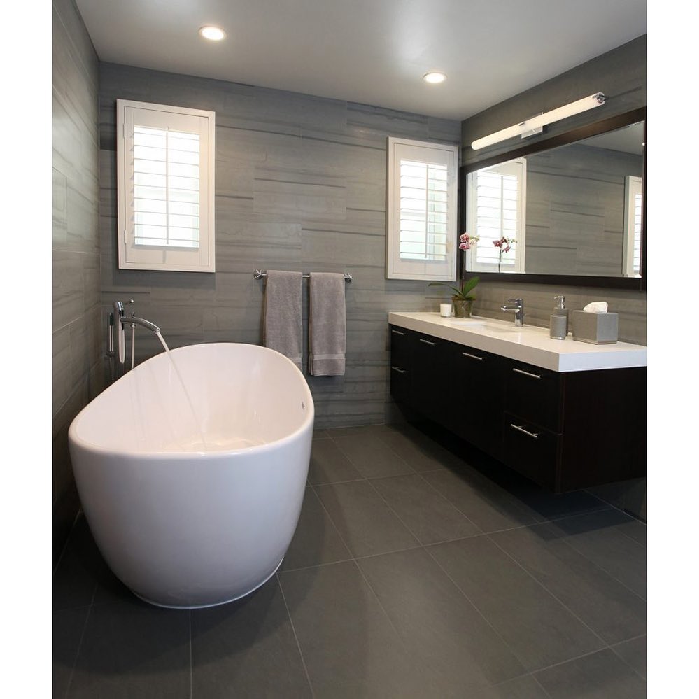 This image showcases a tastefully designed bathroom that exudes a serene vibe, with hues of grey, white, and black dominating the color palette.