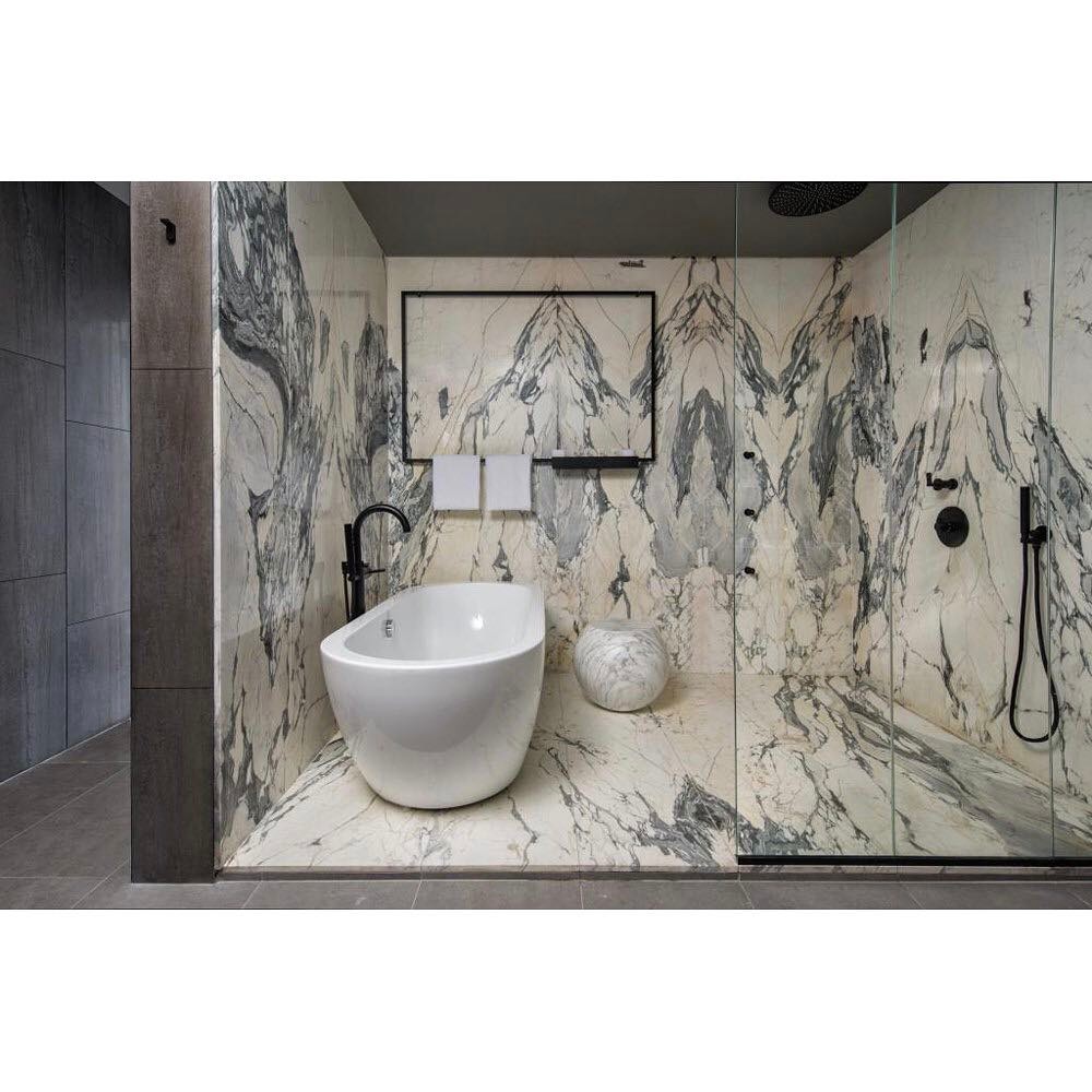 The wall appears to have a marble finish and possibly features a mountain drawing, subtly introducing elements of nature into the indoors.