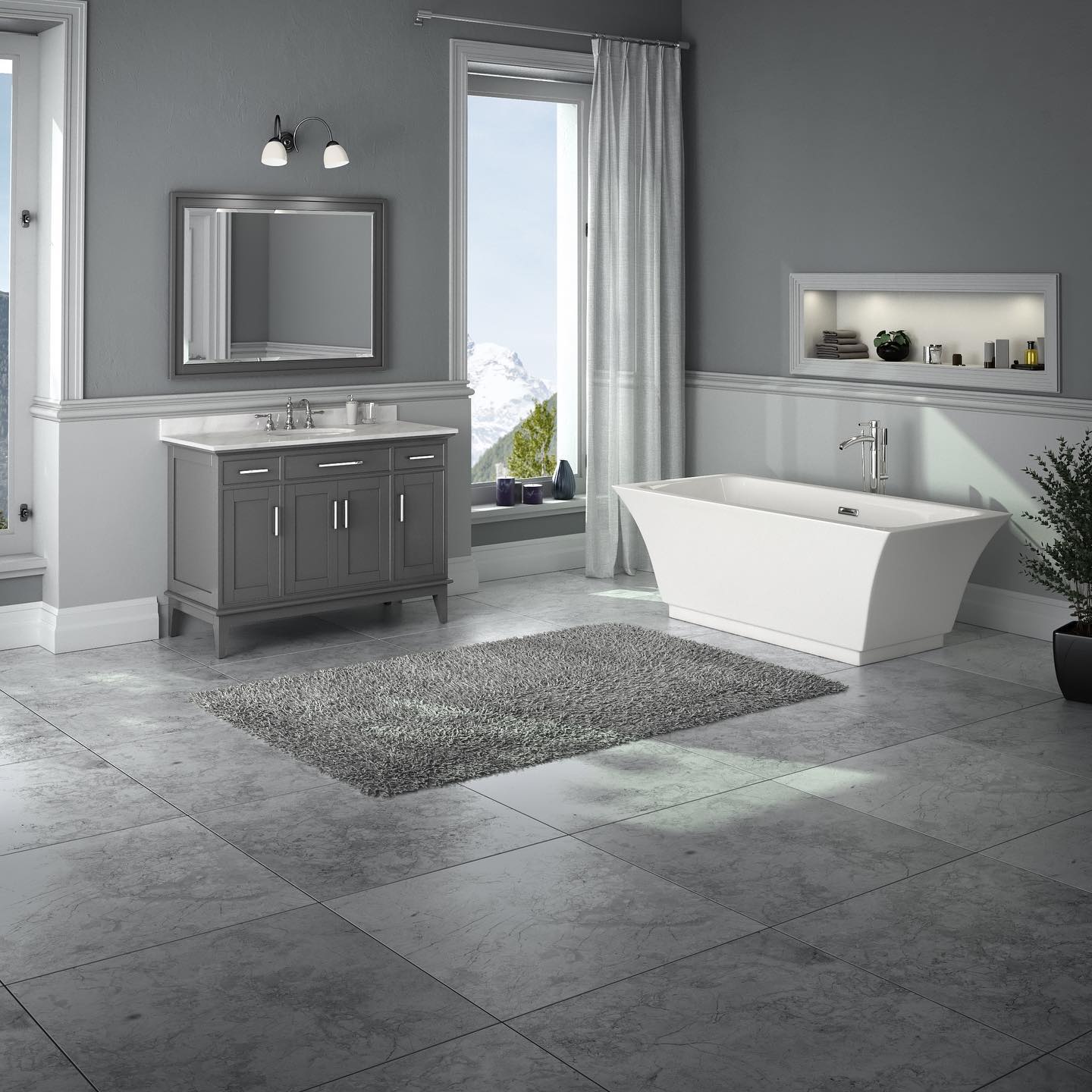 Central to the room is a sleek white bathtub placed on a plush grey rug, that contrasts beautifully with the tile flooring.