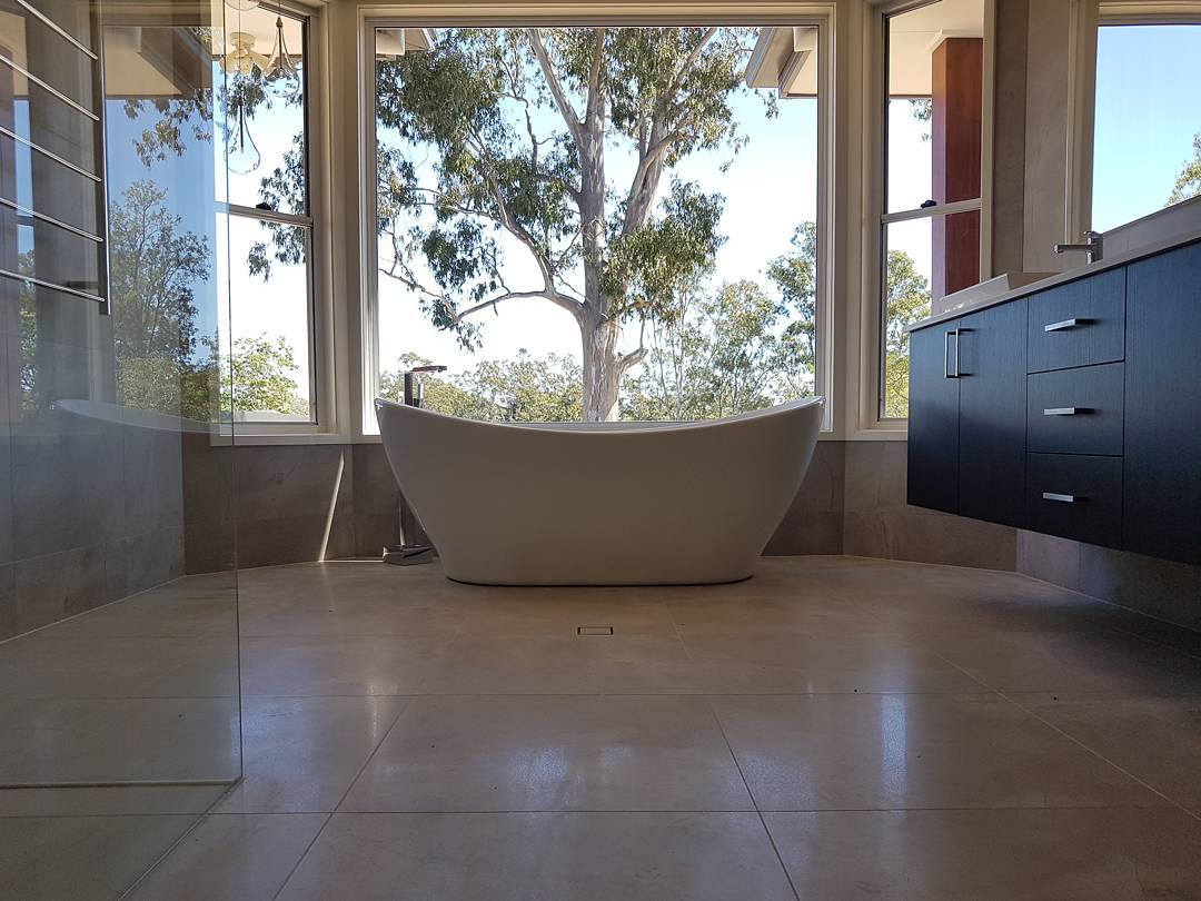 On the floor, one can see the reflection of the tub and the window, further enhancing the room's spacious feel.