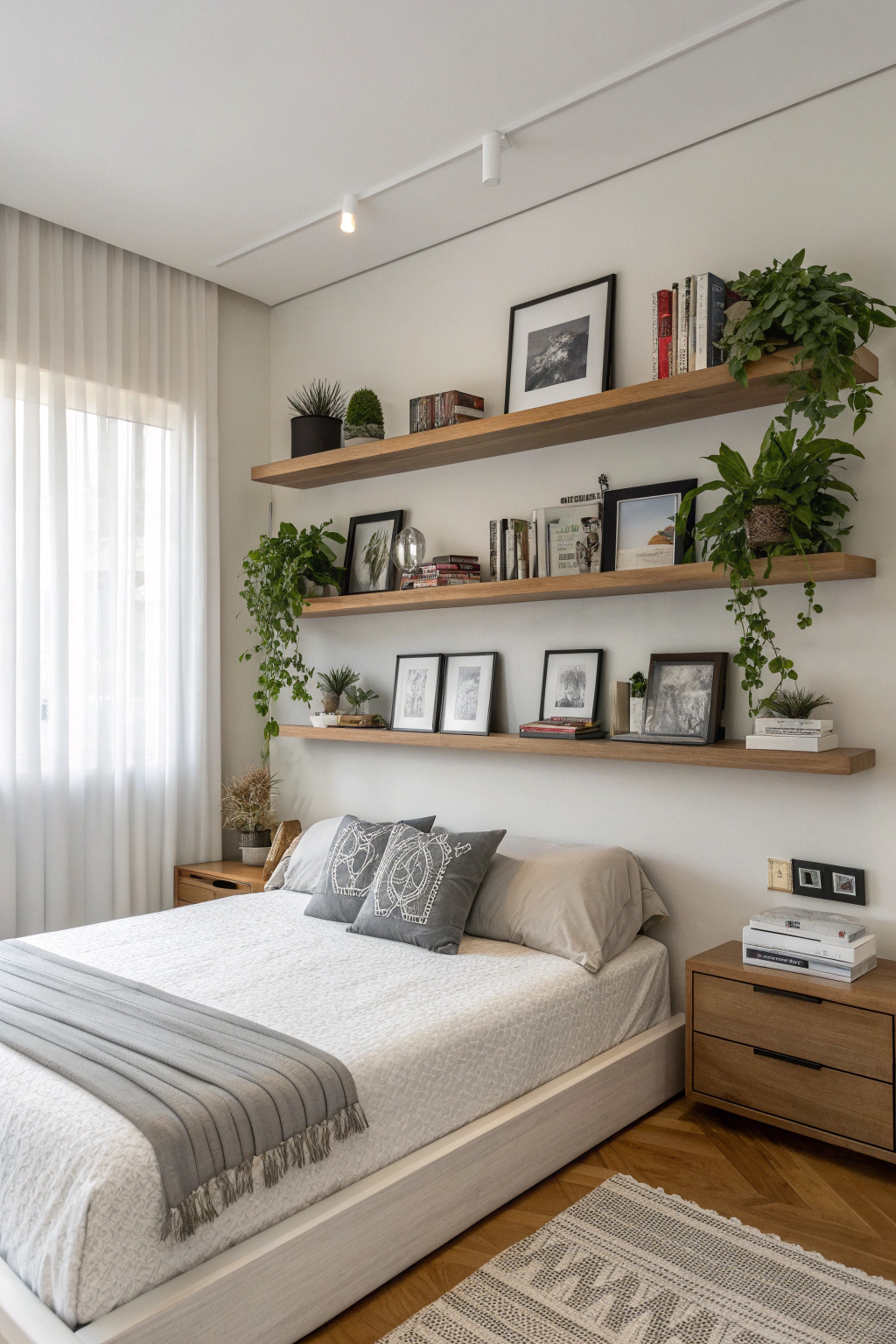 For a modern look that maximizes space, consider using floating shelves in your bedroom. They not only save floor space but also add a stylish touch. You can display your favorite books, cherished photos, or vibrant plants effortlessly.