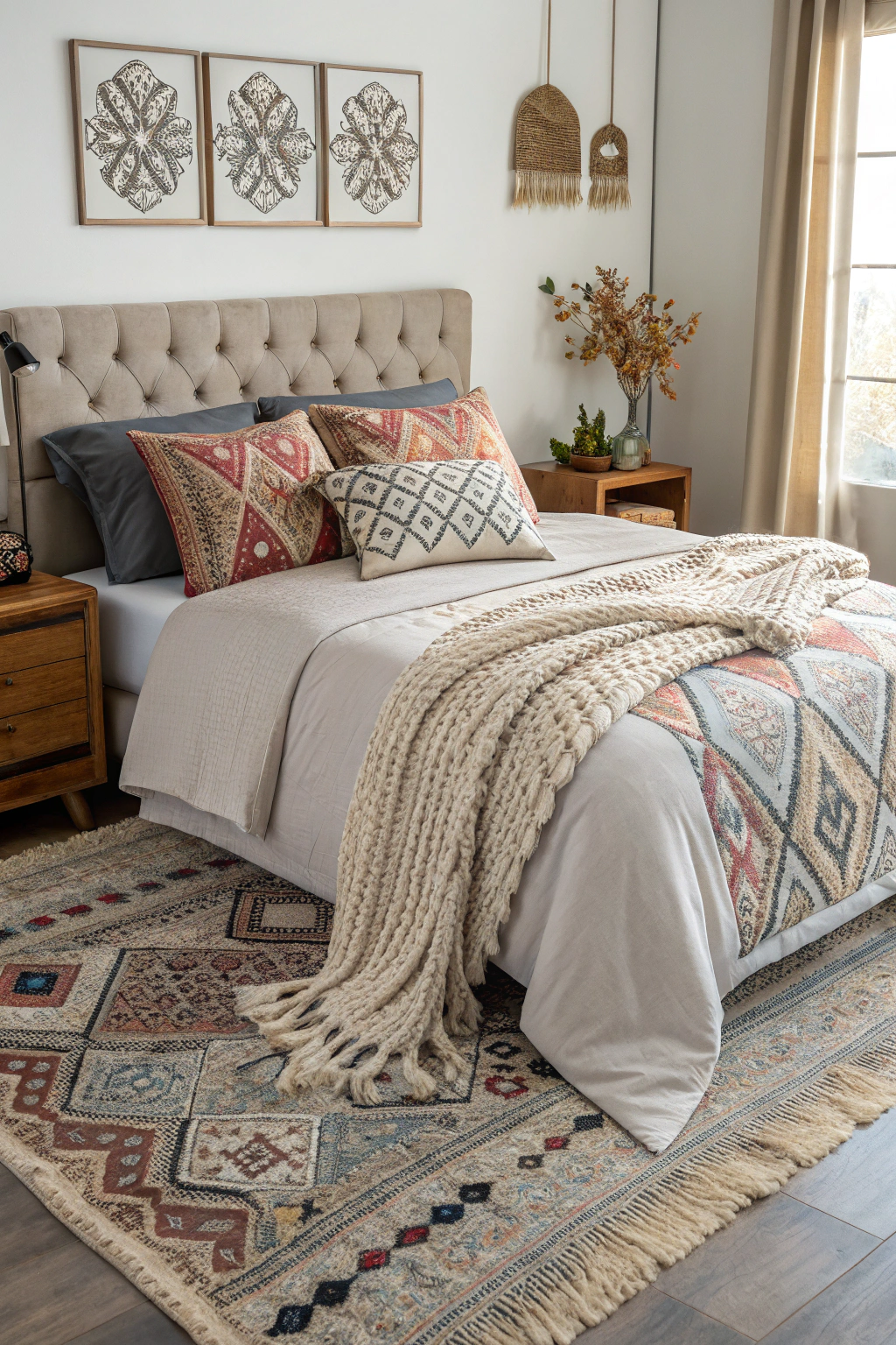 Incorporating stylish storage solutions can complement your textured, layered bedroom while keeping it organized. Baskets are perfect for adding charm and functionality. Place them on shelves, under nightstands, or in corners to declutter and elevate your space's aesthetic.
