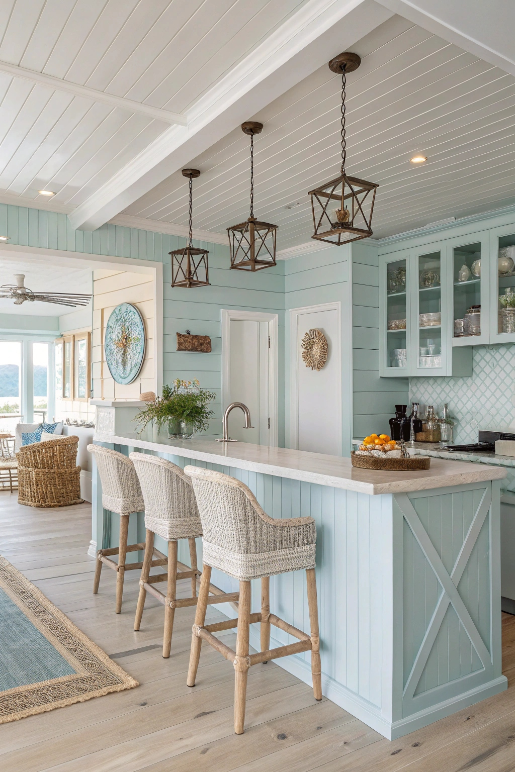 Creating a coastal vibe kitchen bar invites a rejuvenating and airy atmosphere into your home. Opt for light, breezy colors like soft blues and whites, complemented by natural wood elements. Incorporate seashell decor or nautical accents to enhance the theme. Use bar stools with woven details for comfort and style. This fresh, inviting space is perfect for gatherings and relaxation.
