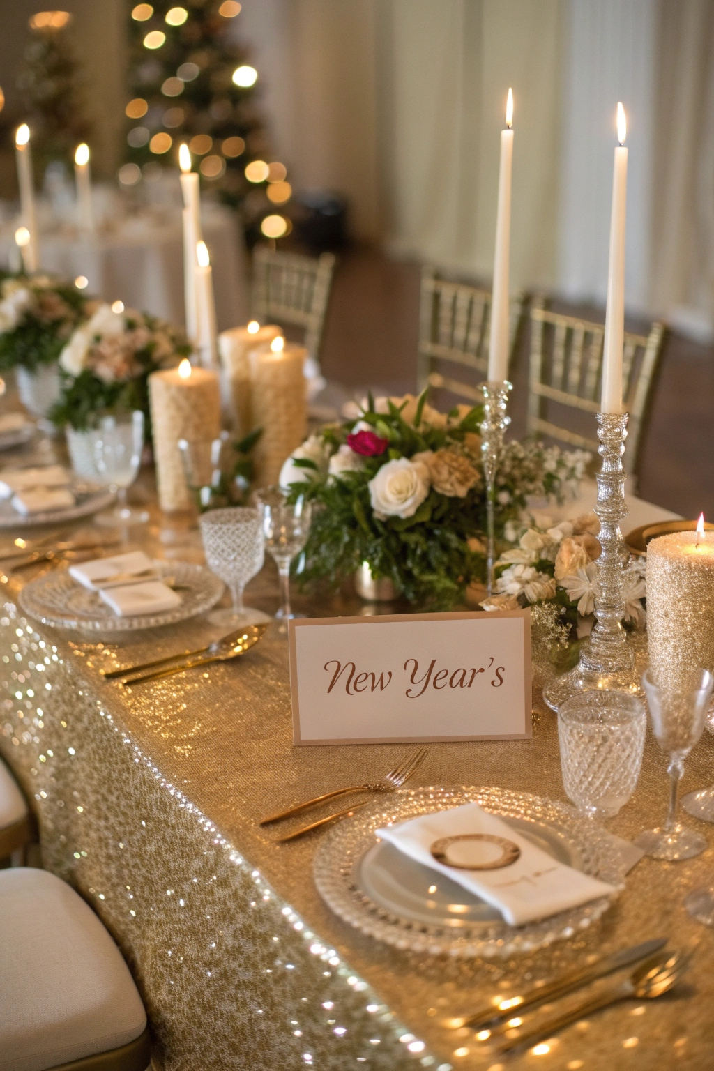 For your New Year's celebration, transform your table into a dazzling display of glamour and sophistication. Use shimmering metallics like gold or silver tablecloths, and don't forget elegant glassware. Add glittering candles for a sparkling ambiance. Incorporate chic centerpieces with lush flowers or crystal accents. Place stylish, personalized name cards for each guest. Your table will captivate everyone and set the perfect tone for the night.