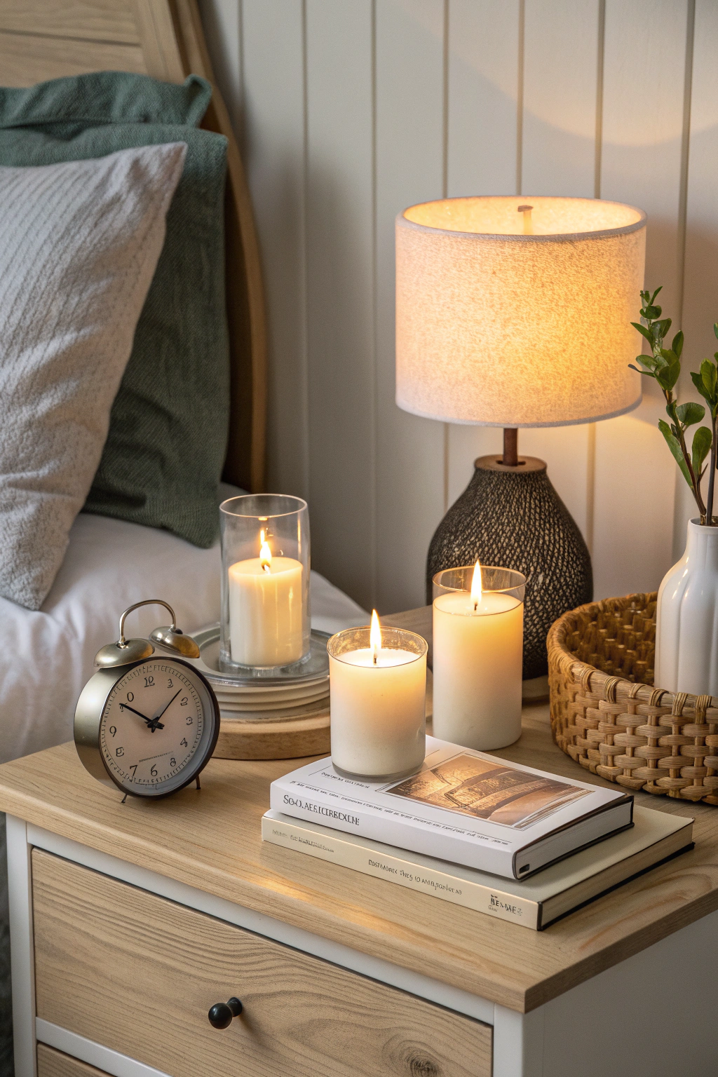 Adding candles to your bedroom can enhance the warmth and ambiance created by your nightstand lighting. They bring a cozy feel and can also serve as decor. Here are some ideas to incorporate candles effectively: