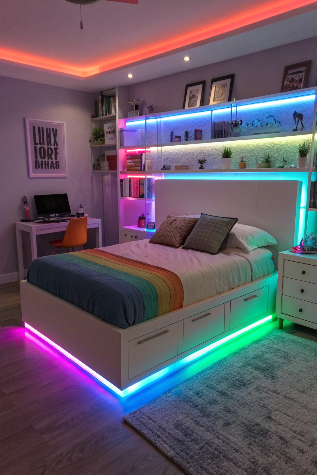 Illuminate your bedroom with vibrant colors using color-changing LED strips. These versatile lights can transform your space effortlessly. Here are some fun ways to use them: