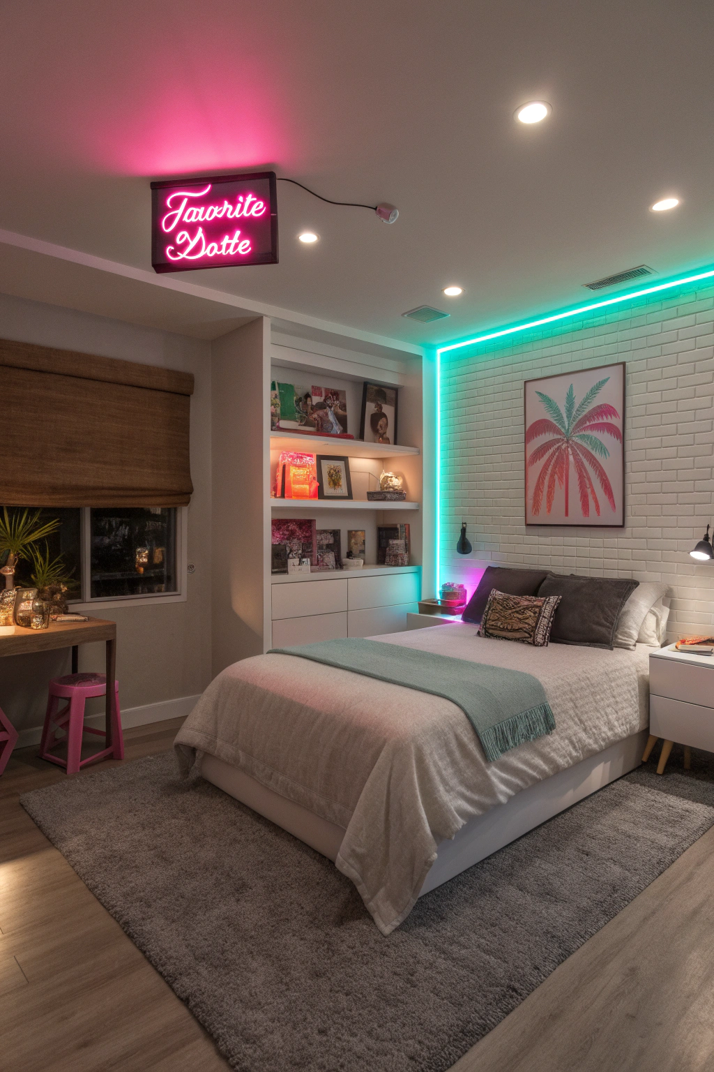 Recessed lighting sets a calm tone in your bedroom, but if you want to inject some personality and flair, neon signs can take your decor to the next level. Consider these ideas: