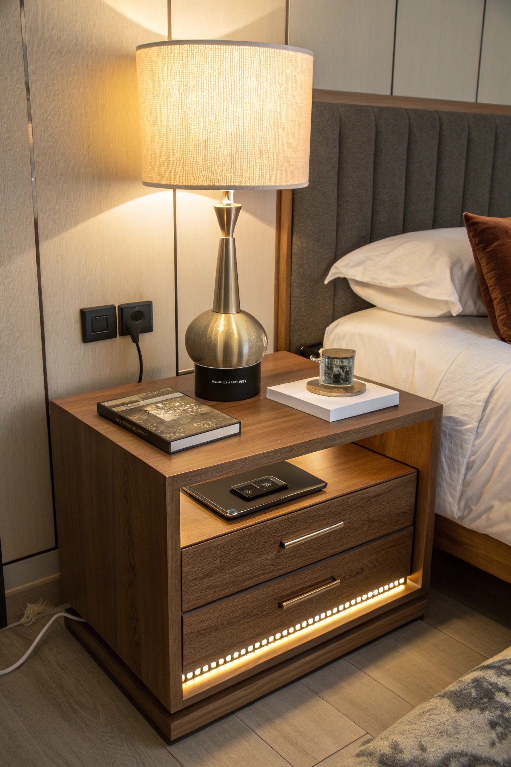 Your nightstand's lighting can set the perfect mood for relaxation and comfort. Consider using a stylish table lamp with a soft, warm glow or a sleek LED strip hidden under the edge. A pendant light can also create a unique look while freeing up space. Don't forget dimmable options, as they let you easily adjust brightness for reading or unwinding at night.